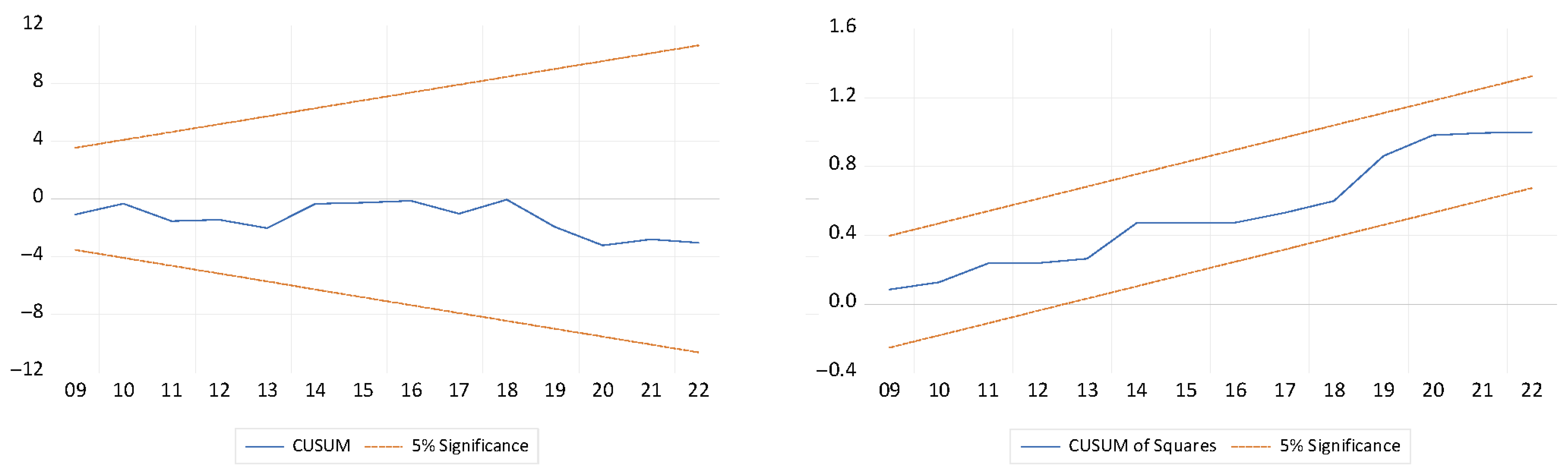 In the short and long run, the impact of LCH4 on LFOS is positive, and has the highest impact on LFOS in this study. It is important to emphasize that methane emissions are not a productive input into agriculture, but rather a by-product of agricultural activities, particularly livestock production and rice cultivation. Methane (CH4) emissions are used as a proxy for agricultural intensity due to agriculture being the dominant CH4 source in Nigeria. Therefore, the positive long-run association observed between CH4 emissions and food security should not be interpreted as methane improving food security per se. Instead, this relationship reflects scale effects in agricultural production, whereby increases in food output are accompanied by higher methane emissions. This interpretation aligns with the broader climate-food literature and avoids conceptual confusion regarding the role of greenhouse gases in food systems.