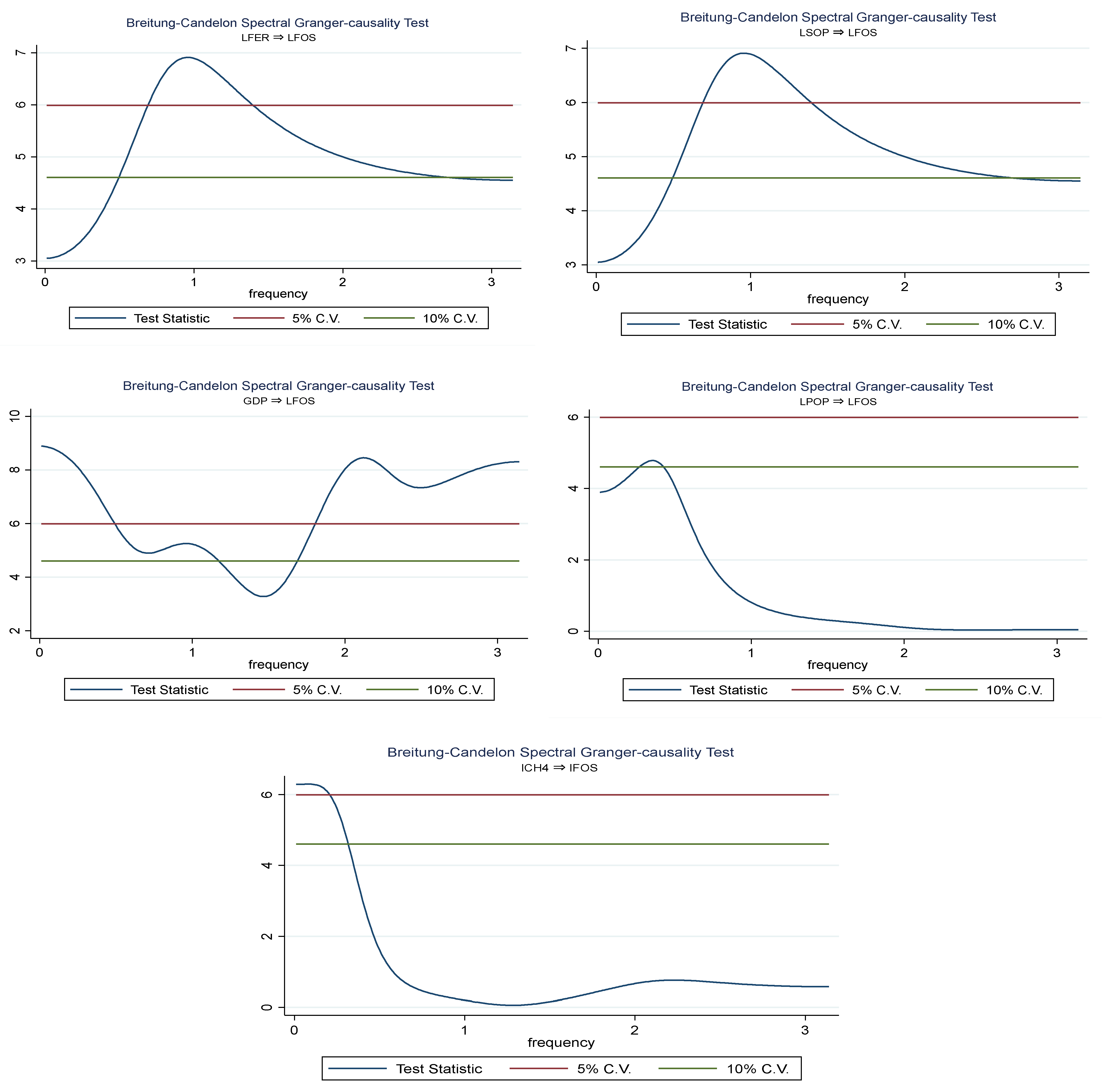 Figure 3 presents the Spectral Granger Causality results, illustrating how the causal relationship between the explanatory variables and food security varies across different frequencies. In this framework, low frequencies correspond to long-run or structural relationships, whereas high frequencies capture short-run or transitory dynamics. When the estimated causality curve exceeds the 5% critical value line, the null hypothesis of no causality is rejected at the corresponding frequency band. This approach, therefore, allows us to distinguish whether a variable influences food security primarily in the short run, the long run, or both. For instance, fertilizer use and methane emissions display stronger causal effects at higher frequencies, indicating predominantly short-term influences, while GDP exhibits more pronounced causality at lower frequencies, suggesting a dominant long-run relationship with food security in Nigeria.