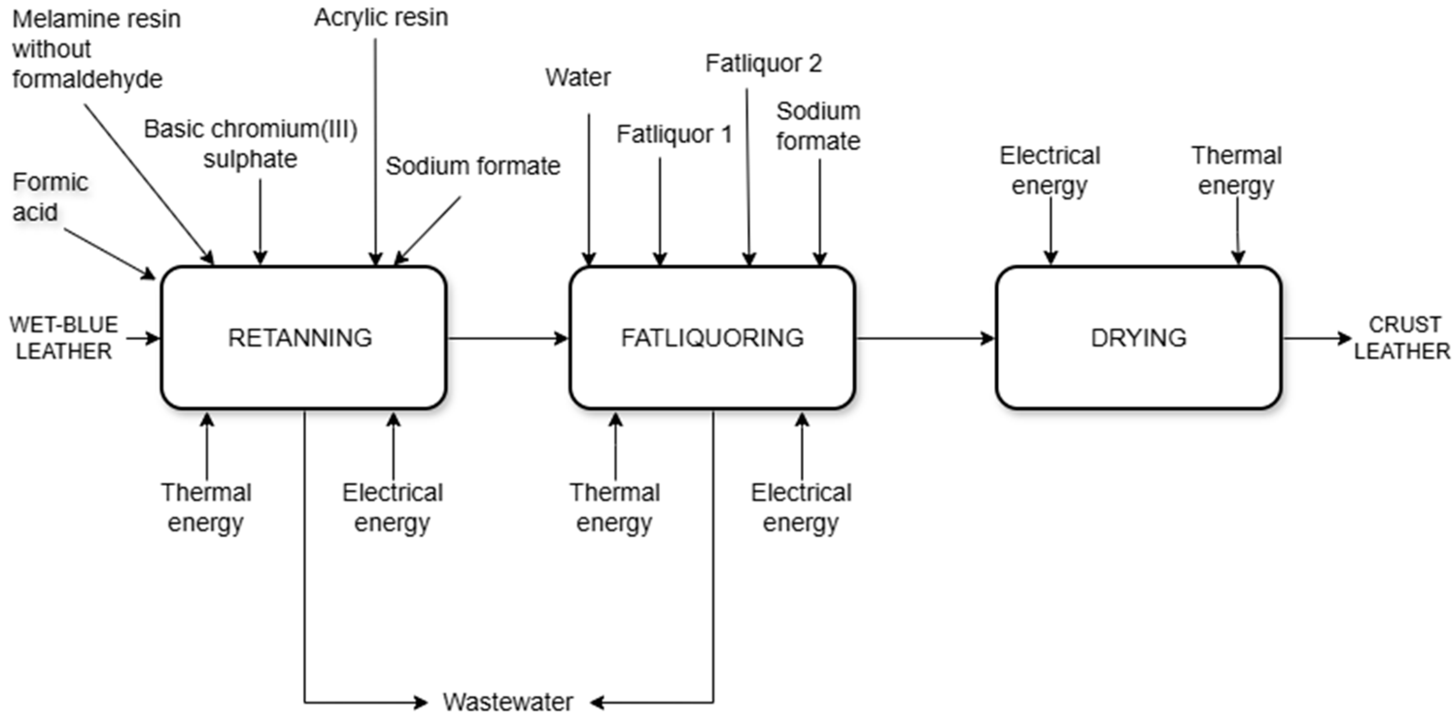 - Tasca, A.L.; Puccini, M. Leather tanning: Life cycle assessment of retanning, fatliquoring and dyeing. J. Clean. Prod. 2019, 226, 720–729. [Google Scholar] [CrossRef]