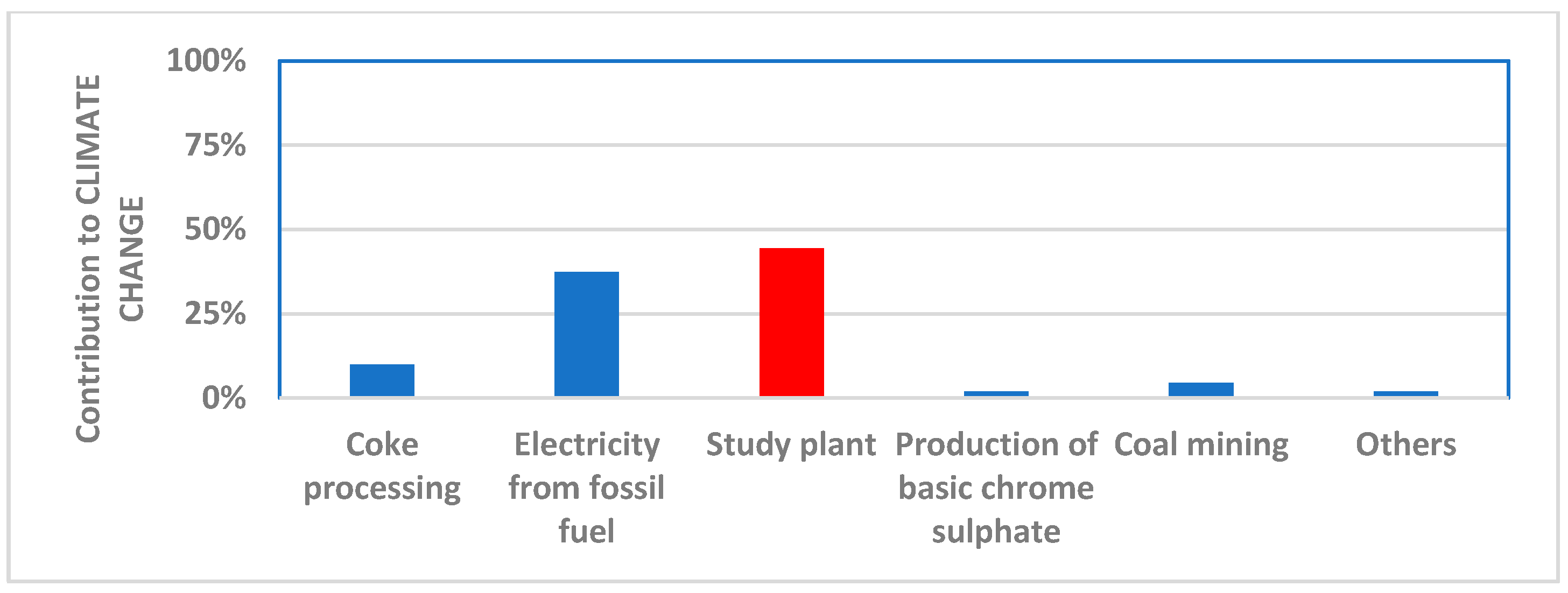 - Climate change: Figure 4 shows that the relevance of the plant in this category, considered just for the post-tanning, is 44.4%; therefore, its relevance on the whole process can be assessed at most in the order of 2.8%.