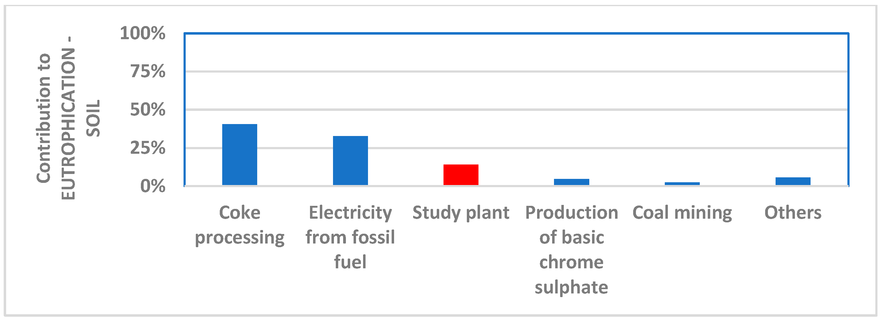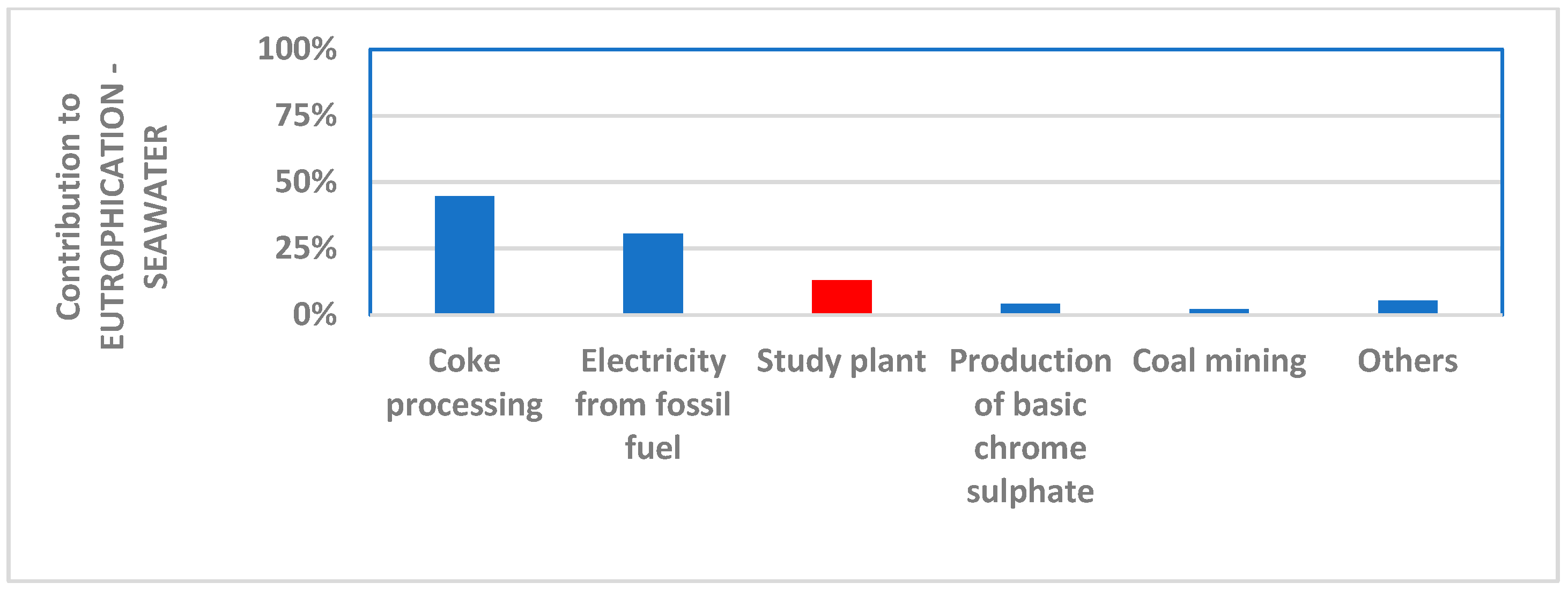 - Moderate contribution. The values cannot be neglected, but they are not predominant in the whole impact. It is the case of acidification (11.3%), eutrophication of seawater (13%), eutrophication of soil (14.1%), and photochemical ozone formation (13%). The value in brackets represents the direct contribution of the plant to the whole impact.