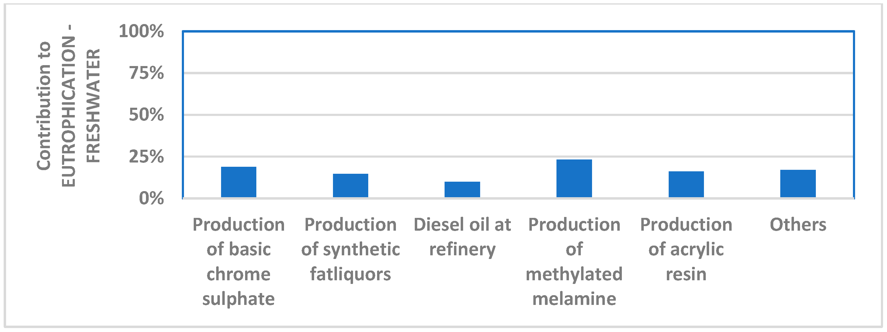 - Scarce or null contribution. This holds for very low or absent contributions. When this occurs, the post-tanning installation has no environmental impact. At a glance, it is evident that for 11 categories, namely, ecotoxicity for freshwater, eutrophication of freshwater, human toxicity with cancer effects, human toxicity without cancer effects, ionising radiation with effects on human health, land use, ozone depletion, particulate matter, use of fossil fuels, use of minerals and metals, and water use.