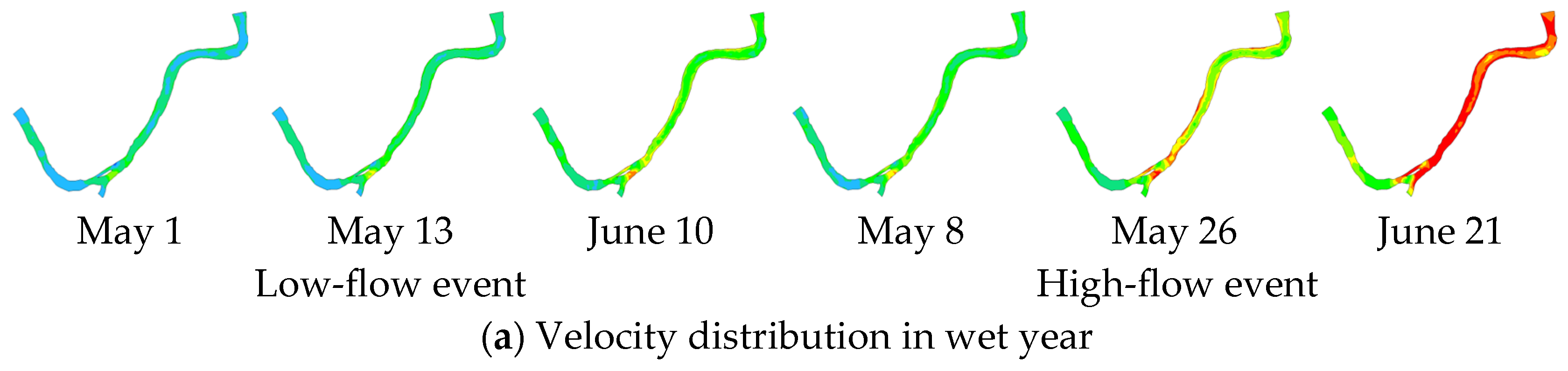 4.4. Hydrodynamic Simulation of Environmental Flow Regime During Spawning Period