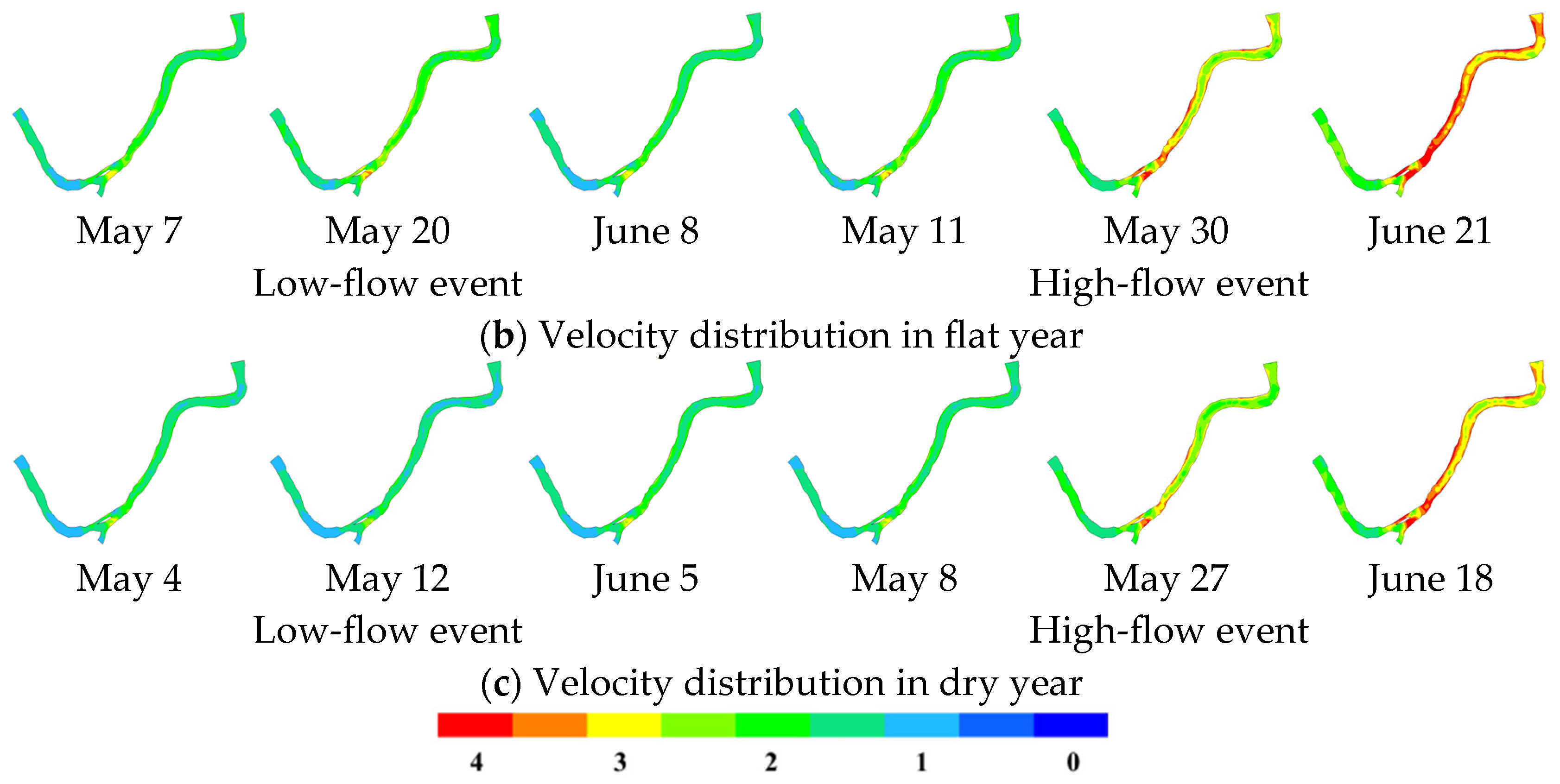 4.1. Flow Process Characteristics of FMCC During Spawning Period
