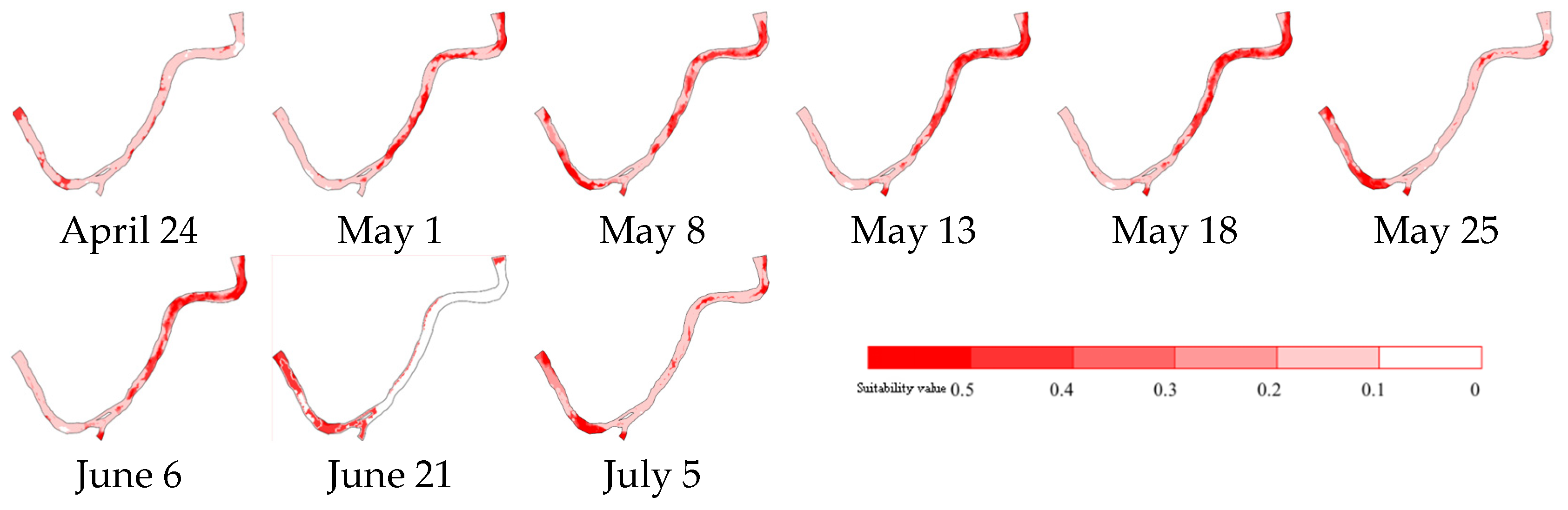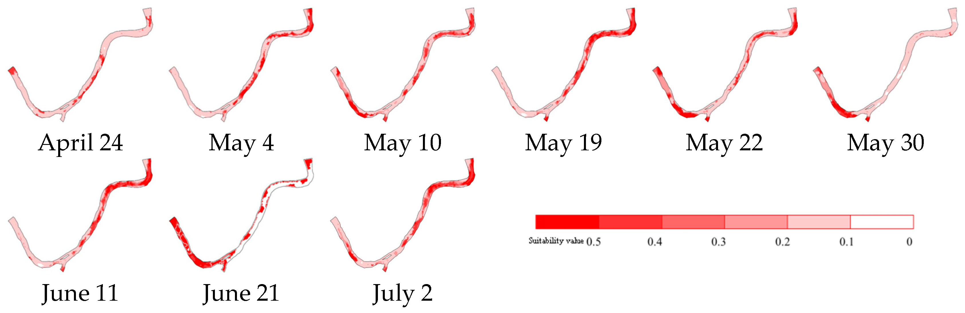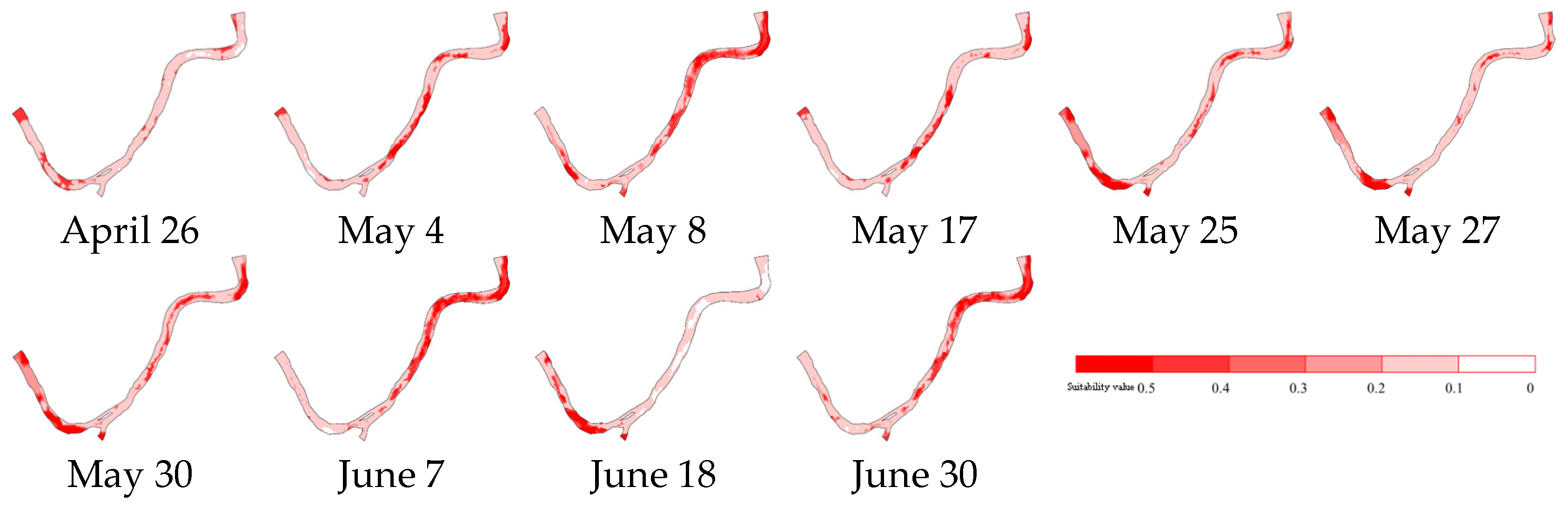 - Zhou, H.; Yu, C.; Xu, Z.; Zheng, Y.; Hou, X. Spatial suitability evaluation of spawning reach revealing the location preference for fish producing drifting eggs. Front. Mar. Sci. 2022, 9, 947908. [Google Scholar] [CrossRef]