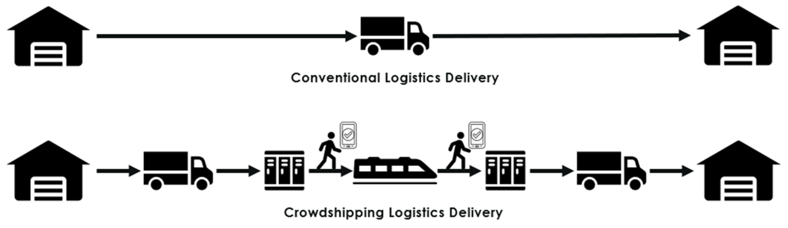 Figure 1, which shows the crowdshipping package delivery procedure and visualizes the procedure for crowdshipping delivery. Due to the relative novelty of crowdshipping as a concept, it is intended as a scenario-based representation at a conceptual level in accordance with the economic and cooperative analysis rather than a detailed operational representation, which includes other parameters such as routing, scheduling, and capacity.