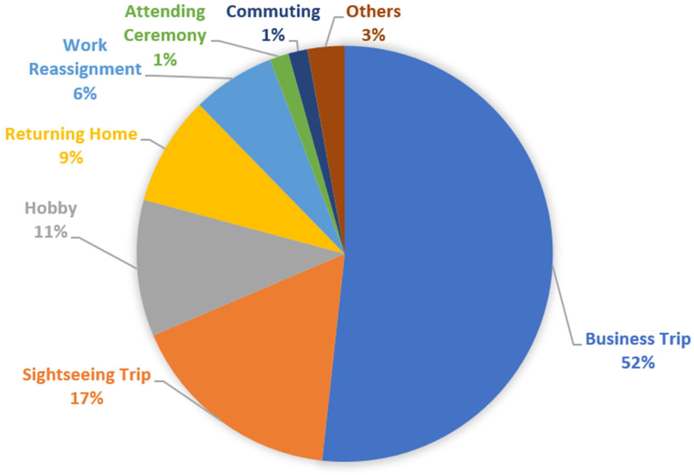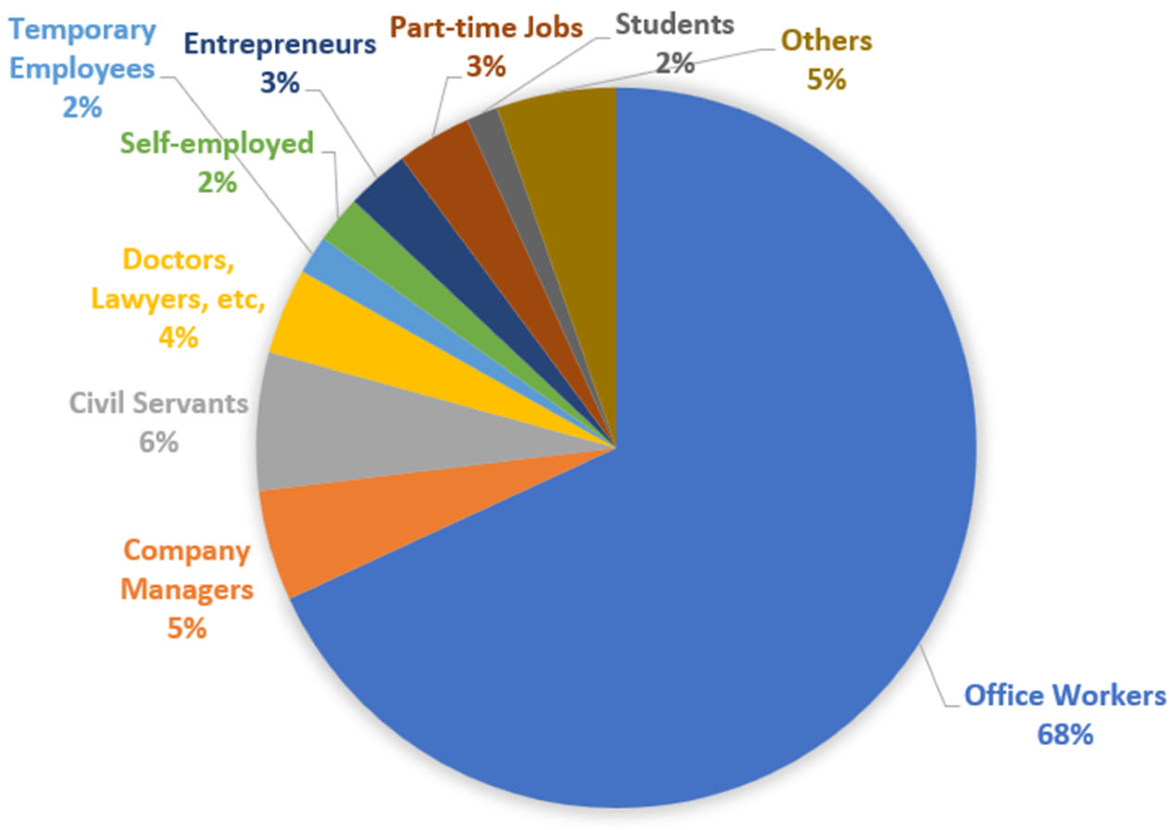 The passengers of the Tokaido Shinkansen can be further divided based on several indicators. Based on their occupations, more than 65% of the passengers are office workers, as shown in