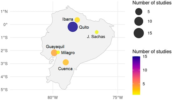 The review included a total of 26 studies that analyzed atmospheric pollution associated with vehicular traffic in Ecuador. A comprehensive summary of the characteristics, pollutants assessed, study locations, and main findings of these studies is provided in Supplementary Table S1. The majority of these studies focused on Quito, which served as the study site in at least 15 investigations, covering urban and peri-urban monitoring stations, schools, industrial zones, road corridors, and satellite or atmospheric modeling analyses [23,24,25,26,27,28,29,30,31,32,33,34,35,36,37] (Figure 1). This predominance confirms Quito’s role as the country’s primary center for air quality research due to its basin-like topography, high altitude, and dense vehicle fleet.