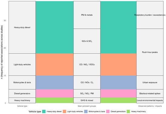 Conceptual synthesis of vehicle types and associated pollutant profiles reported in Ecuadorian studies.