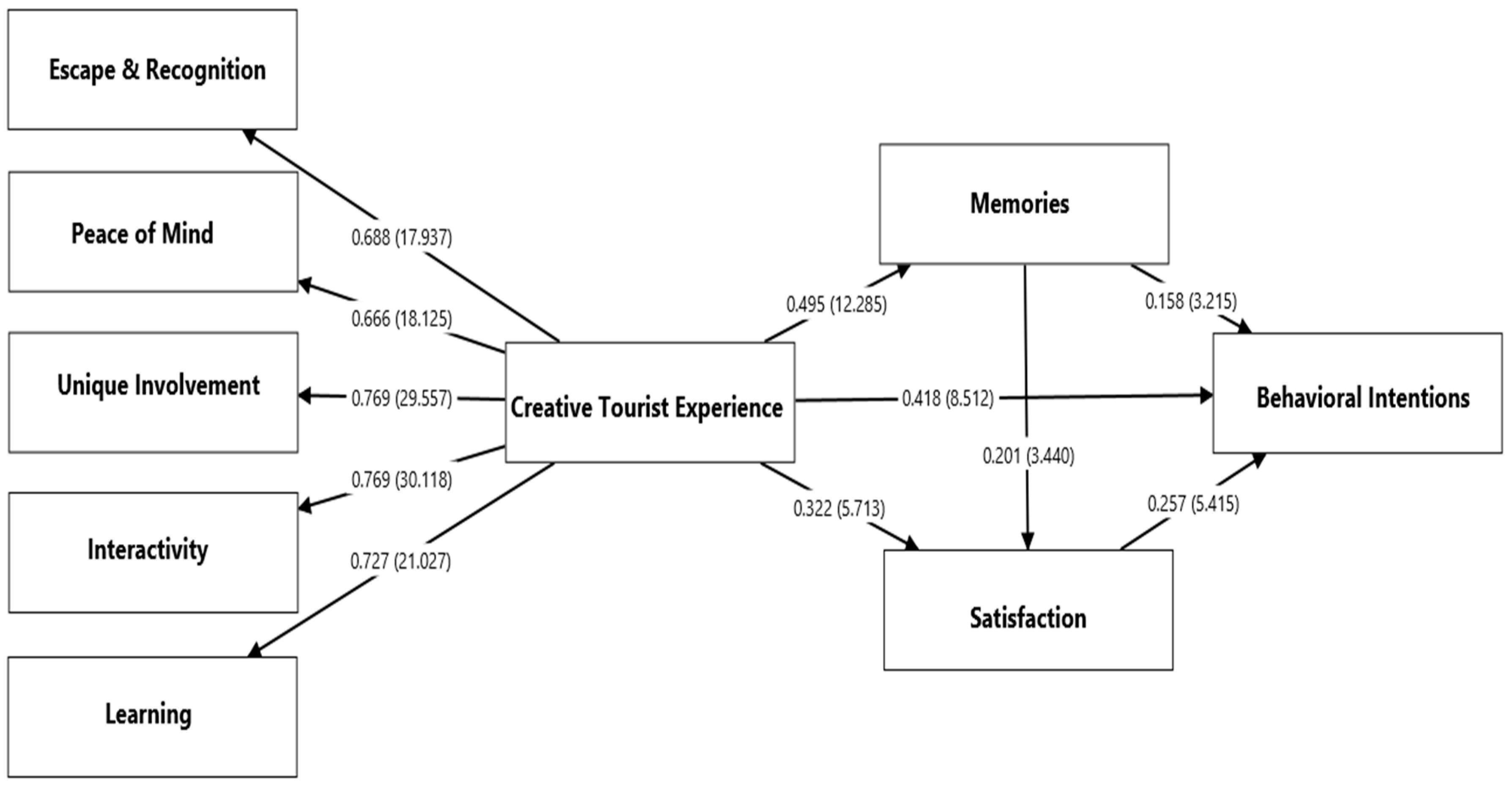 | H1 | Creative Tourist Experience → Behavioral Intentions | 0.418 | 0.049 | 8.512 ** | Supported |