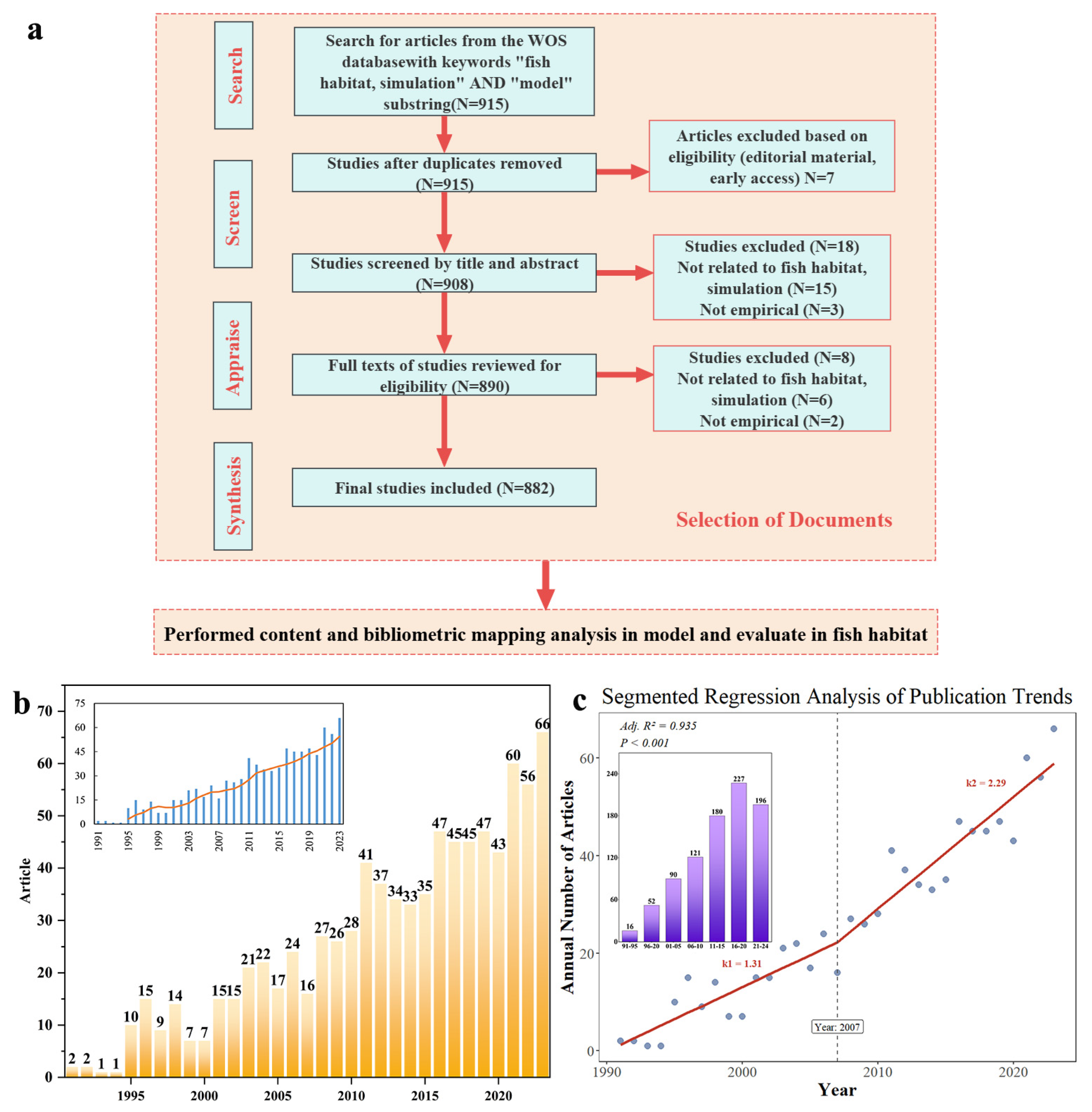 - Incipient Stage (1991–2007): Prior to the breakpoint, the field experienced moderate growth (linear slope, m = 1.31). Annual publication volumes generally fluctuated between 1 and 24, a period of foundational accumulation.