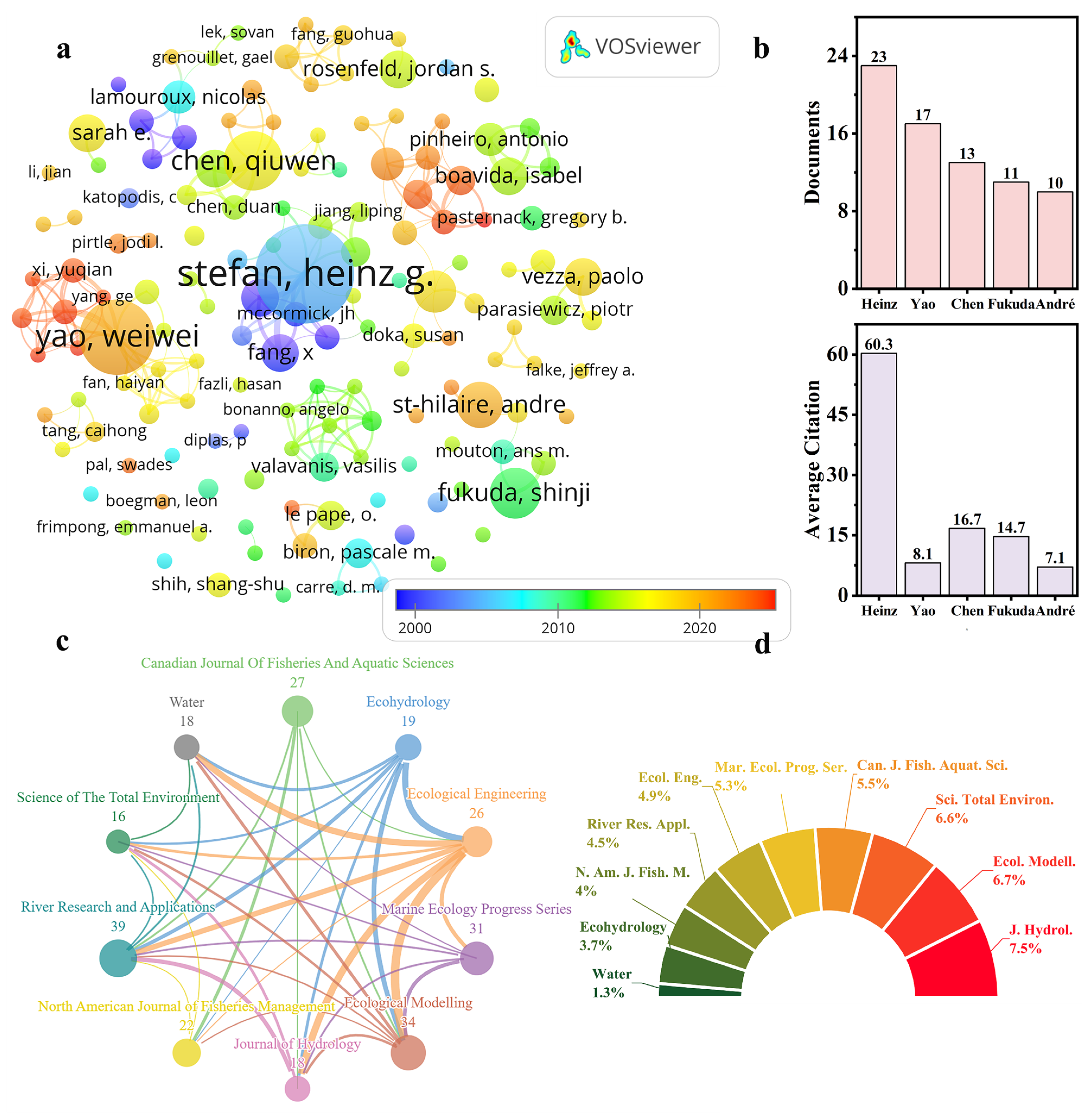 - Rapid Expansion Stage (2007–2023): Post-2007, the scholarly output witnessed a substantial acceleration. The growth rate shifted upward with a steeper slope (m = 2.29). This accelerated trend culminated in a peak of 66 articles in 2023, reflecting the increasing integration of global eco-hydrology research and habitat suitability modeling.