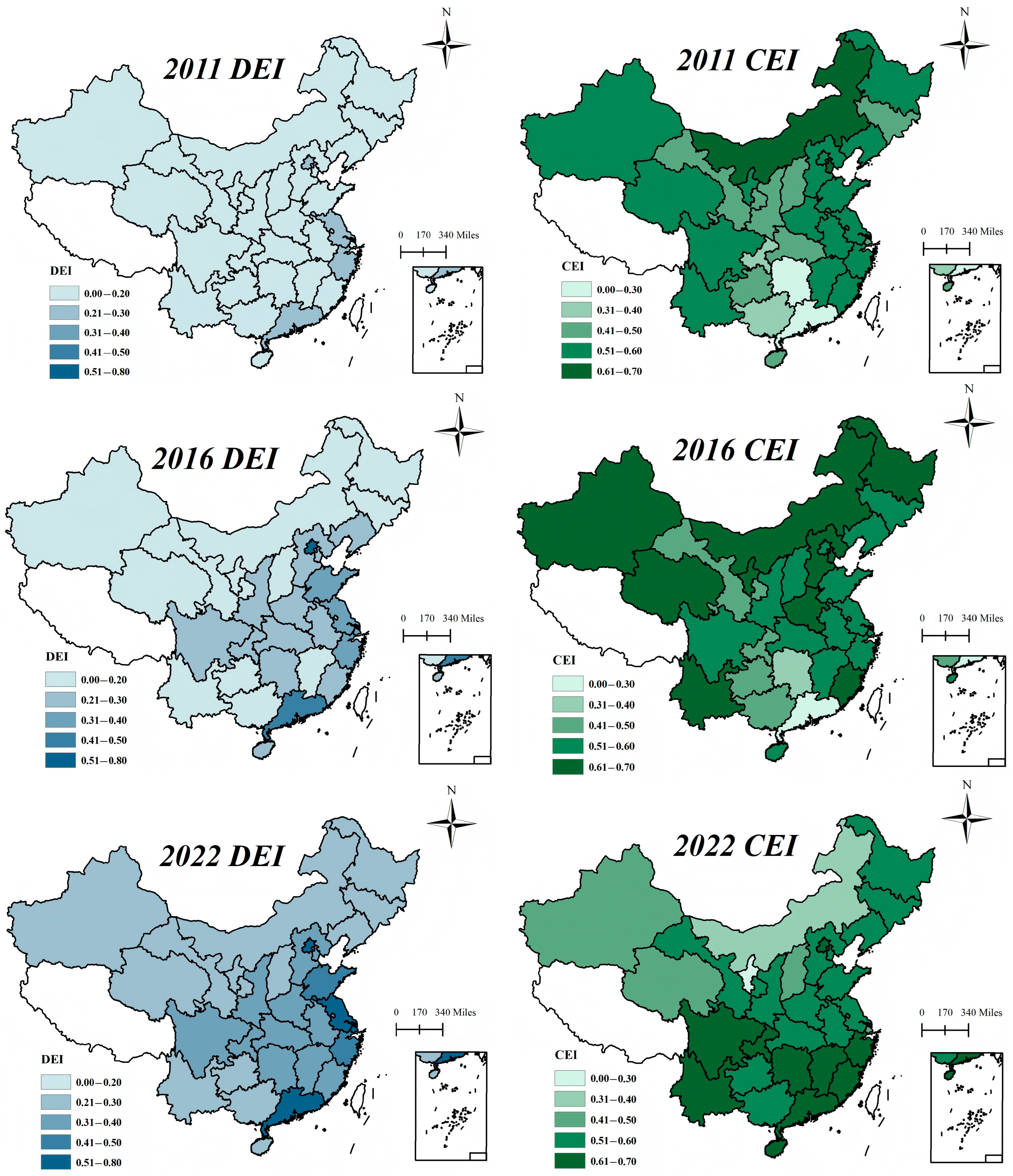 In contrast, the pattern for CEI shows that carbon-emission pressures remain significant in certain regions, especially in western provinces like Inner Mongolia and Xinjiang, where the CEI values remain relatively high. This suggests that these regions continue to face substantial challenges in emission mitigation. Despite progress in digital-economy development, carbon-emission constraints in these areas remain binding.