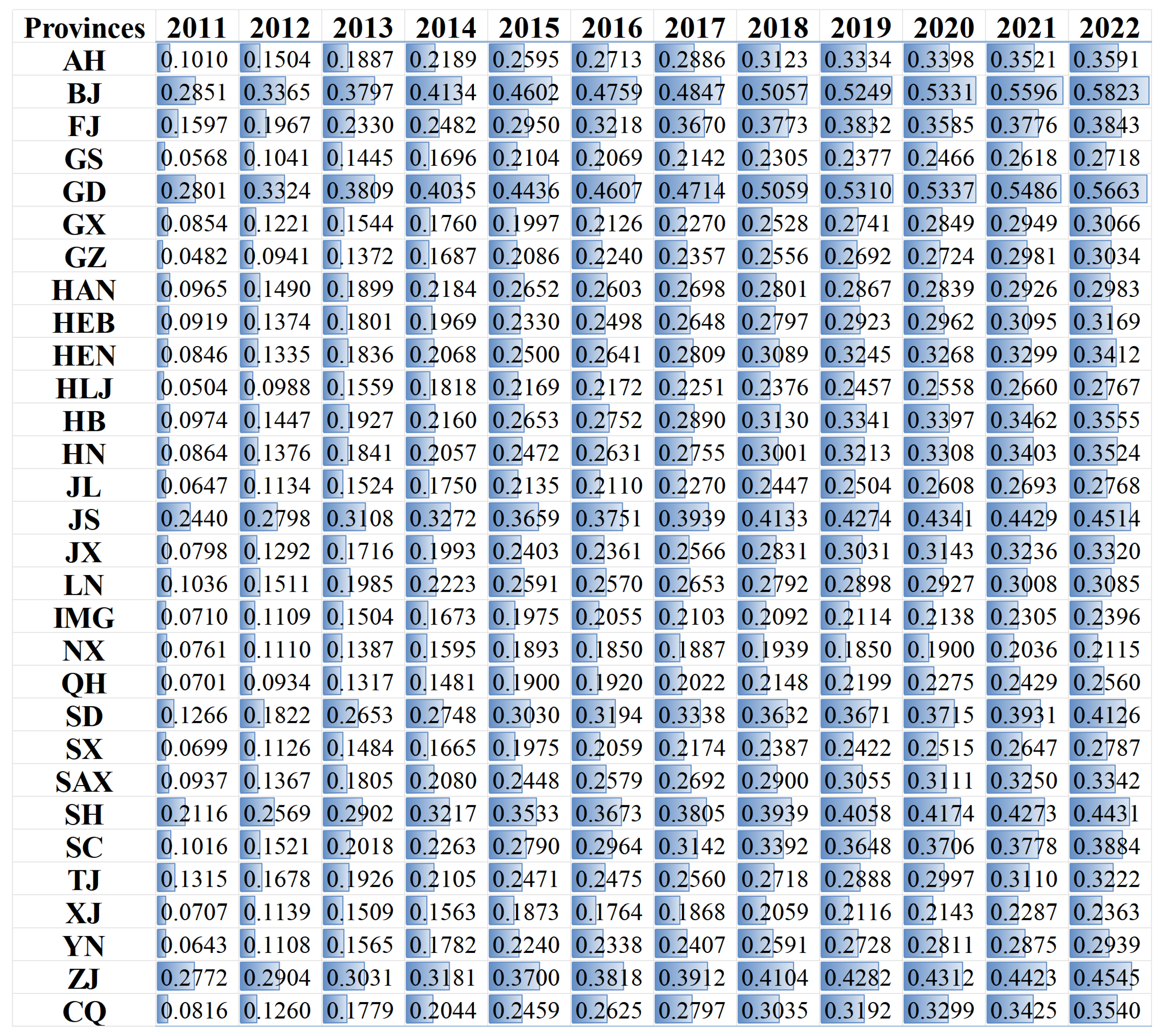 Figure 3 for 2011–2022, the CCD increases in most provinces over time, indicating an overall improvement in the coordination between digital-economy development and carbon emissions. For reference, the descriptive statistics of DEI, CEI, and CCD, including their central tendencies and dispersion measures, are reported in