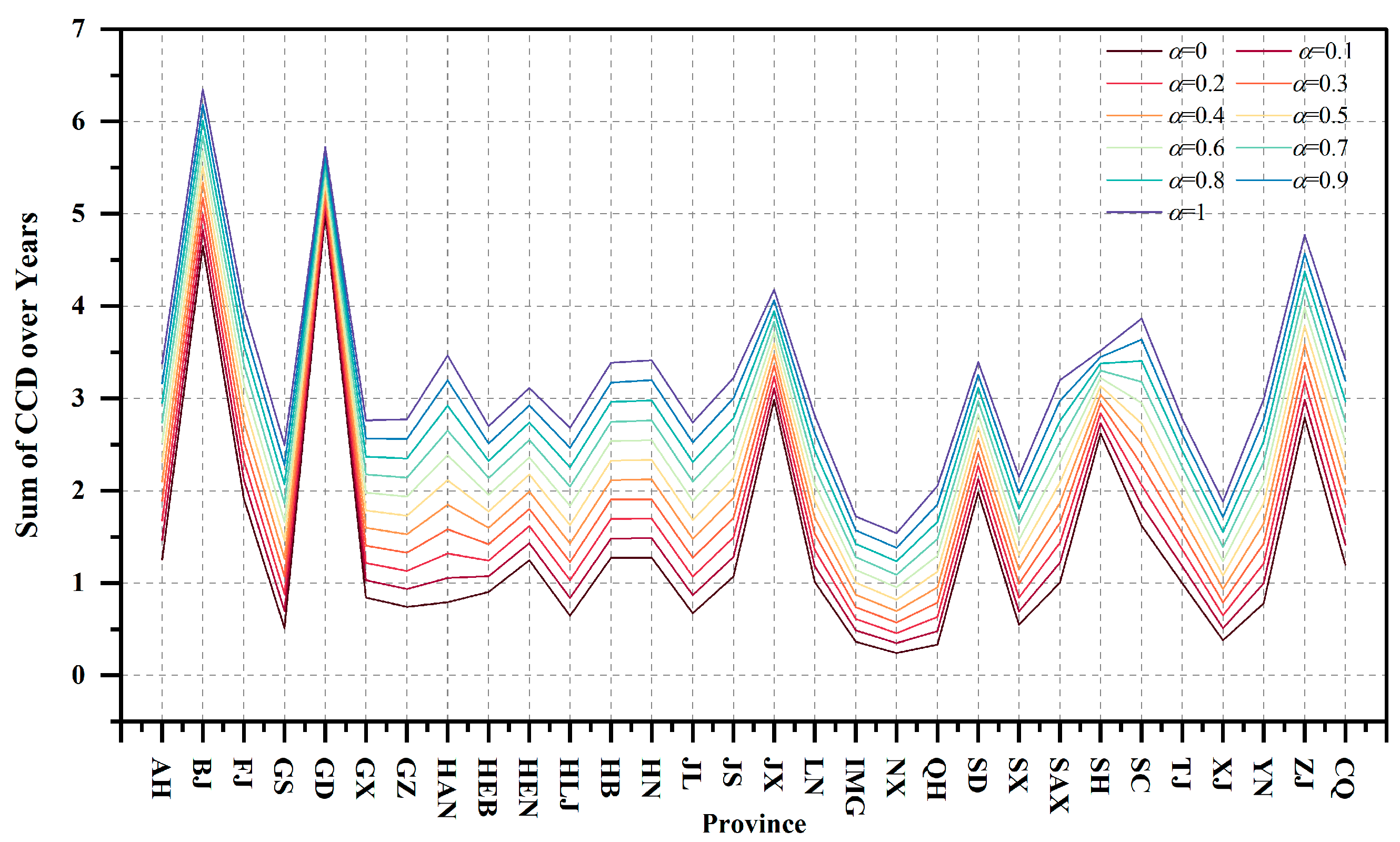 value using the CRITIC–Spearman and entropy weight methods. Based on the re-estimated DEI and CEI, we then recompute the CCD for each province–year and aggregate the CCD values of each province over the study period into a single summary measure for comparability across α settings. By comparing how provincial CCD levels and their relative patterns change as