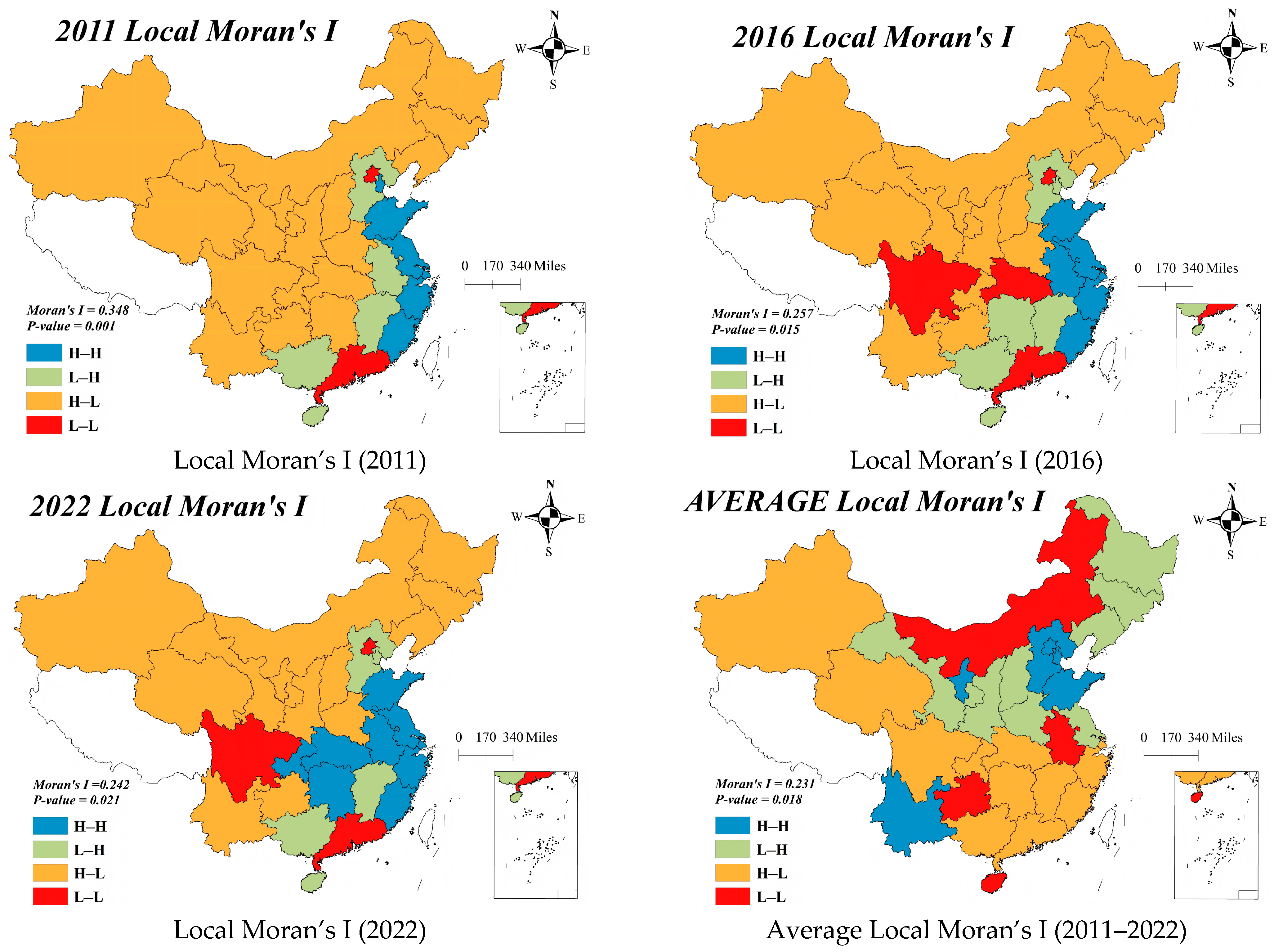 We report the results of local Moran’s I for 2011, 2016, and 2022 and provide the AVERAGE pattern for the 2011–2022 period in