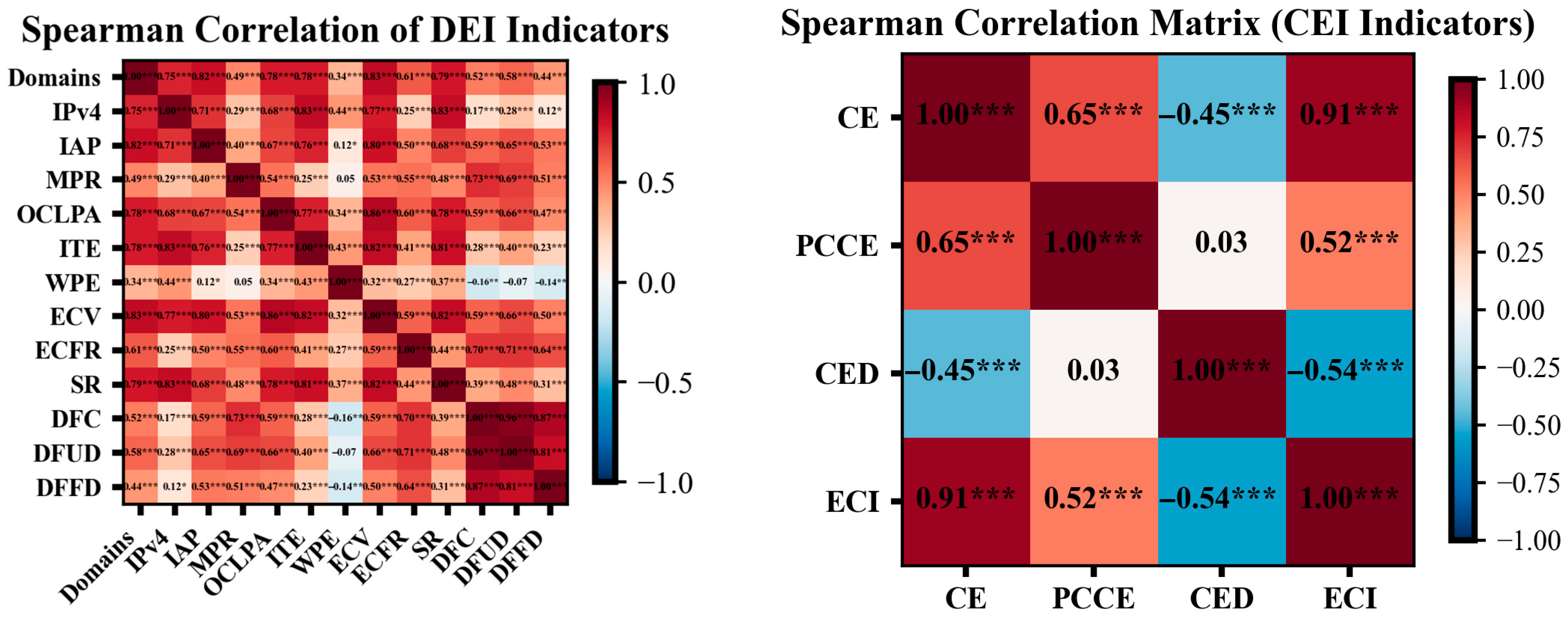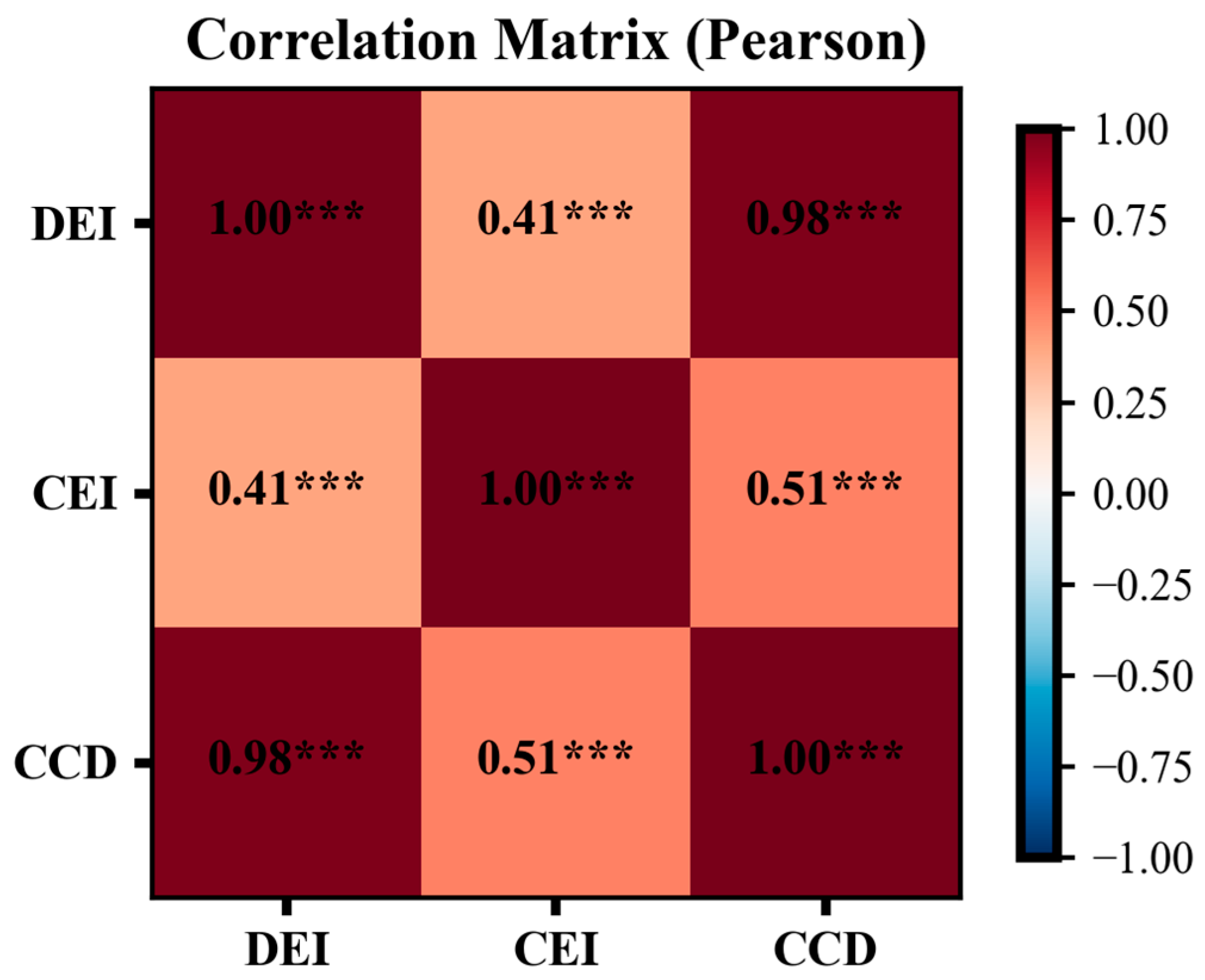 Figure 8 reports the Pearson correlation coefficients among DEI, CEI, and CCD. The results indicate an extremely strong and statistically significant association between the CCD and DEI (r = 0.98,