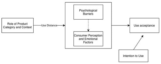These patterns were identified by synthesizing the chosen articles with TAM and IBM constructs to explain resistance toward waste-derived products. As illustrated in the framework (see Figure 2), the process begins with product category and context, which interacts with the user through use distance (physical or sensory proximity). This proximity determines the intensity of psychological barriers (like disgust), which directly influence consumer perception and emotional factors (such as trust). The diagram shows that these internal factors do not operate in isolation; rather, barriers actively shape perceptions, ultimately determining the user’s intention to use and final use acceptance.
