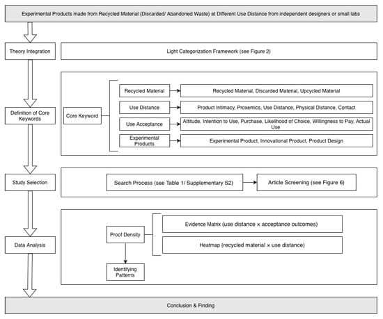 The present review is based on the scoping review approach, an increasingly adopted methodology for summarizing and reporting research evidence [19,20]. This scoping review was conducted without prior registration of a formal protocol in any public database. A scoping review is usually applied to summarize the streams of literature on a general research topic and highlight key trends and research gaps for future research [20]. The review process (see Figure 5) includes three steps: (1) inclusion criteria focus on empirical studies containing any of the mapped core constructs related to recycled materials, use distance, experimental products, and use acceptance; (2) synthesis uses evidence matrices (use distance × acceptance outcomes) and heatmaps (recycled material × use distance) to show directional effects and evidence density, highlighting research gaps; (3) patterns focusing on what the studies are related to are defined and the conceptual framework is deepened, developing a future agenda.