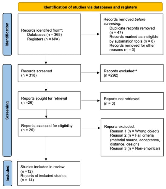 Studies that examined only non-recycled or purely virgin and bio-based materials were excluded, unless recycling-specific results were reported separately. We also excluded studies where the use distance could not be determined and could not reasonably be inferred from the product described, as well as studies written in languages outside our declared scope. Due to the exceptionally low number of results yielded by the first screening (5 from WoS and 3 from Scopus after searching with keyword queries only) on 30 December 2025, we broadened our search string and performed the second search (see Table 1) on 30 December 2025. Twenty-six articles are selected after the first decision based on the above exclusion criteria by the authors. They were manually checked, after which 14 were excluded due to the papers being non-empirical and not fitting the inclusion criteria by the second decision (see Supplementary File S2). Finally, twelve articles are selected of which one included report comprised three empirical essays from “Four Essays on Consumption Behavior in the Circular Economy,” which were treated as three separate studies in the synthesis (see Figure 6 and Table 2).