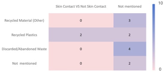 Figure 9 is a heatmap that shows intensity by the number of articles, across two dimensions: recycled material type and use distance for product attributes. The x-axis represents use distance categories, skin contact vs. not skin contact, and includes a “not mentioned” category because many articles do not explicitly address this dimension, ranging from low (blue) to high (red). The main arguments and research subjects across all reviewed texts were categorized and statistically analyzed to generate these scores. Combining Figure 8 and Figure 9 visually presents the relationship between use distance, material type, and acceptance outcomes, thus providing a reference for design and research direction.
