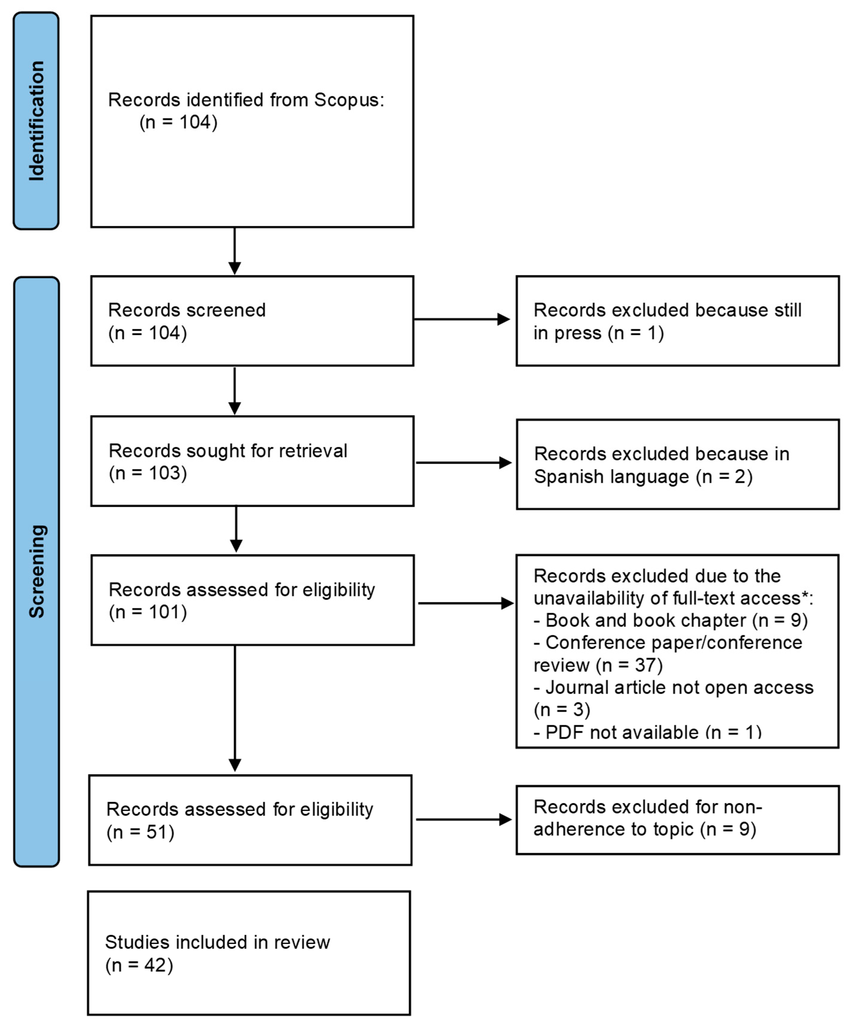 - Scopus was selected as the sole database because it is one of the largest peer-reviewed multidisciplinary academic archives and is widely recognized for its extensive coverage of scientific journals and conference proceedings in the fields of management, engineering, information systems, and sustainability, areas that are highly relevant to the topic of this review. Its broad geographical, thematic, and methodological coverage makes it particularly suitable for analyzing an emerging and cross-cutting field of research such as blockchain applications in coffee supply chains. In addition, Scopus adopts rigorous indexing standards and provides consolidated citation data, helping to ensure the scientific reliability of the contributions included. However, it is recognized that the exclusive use of Scopus could represent a potential limitation, as it may exclude studies indexed in complementary databases. Nevertheless, the breadth and multidisciplinary nature of Scopus were considered sufficient to ensure an adequate representation of the existing academic debate. Future research could benefit from extending the search to additional databases, such as Web of Science, to further strengthen the robustness of the analysis.