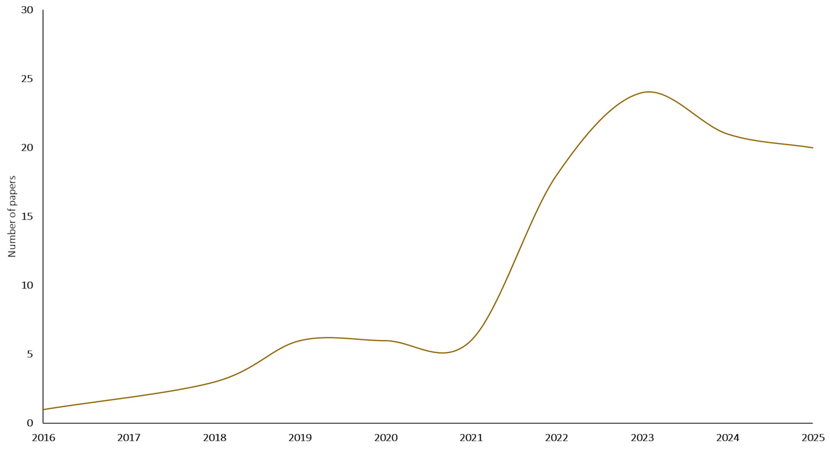 - There is a significant geographical and institutional imbalance in the indexed studies. The available literature focuses mainly on emerging producing countries, while Brazil, despite its central role in global coffee production and trade, is relatively underrepresented. This evidence could indicate a knowledge gap and suggests the need for further empirical analysis in production contexts characterized by more structured governance arrangements and greater market power. From a theoretical point of view, this result reinforces the need to interpret the adoption of blockchain in relation to specific political and institutional contexts, avoiding generalized approaches to coffee supply chains.