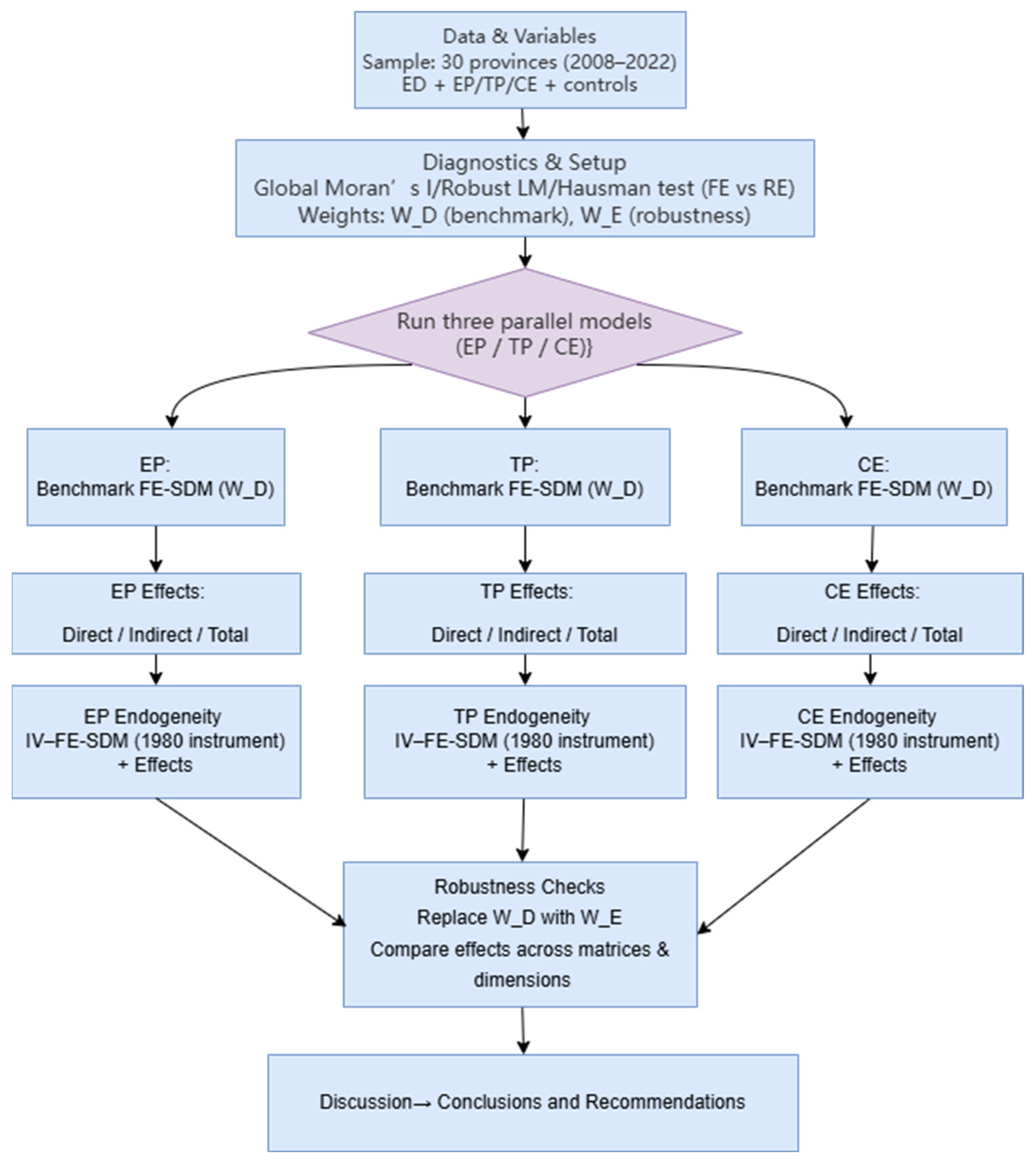 Although more complex estimators can be considered, this study prioritizes a transparent identification strategy that remains comparable across the three performance dimensions. We therefore rely on a two-way fixed-effects SDM complemented by an external historical instrument in an IV-SDM framework, which directly targets reverse causality and spatial simultaneity while maintaining clear policy interpretation. In addition, the robustness of the results is assessed using alternative spatial weight matrices (geographic and economic distance). The comprehensive empirical workflow, integrating these identification strategies and diagnostic tests, is visualized in the methodological flowchart (