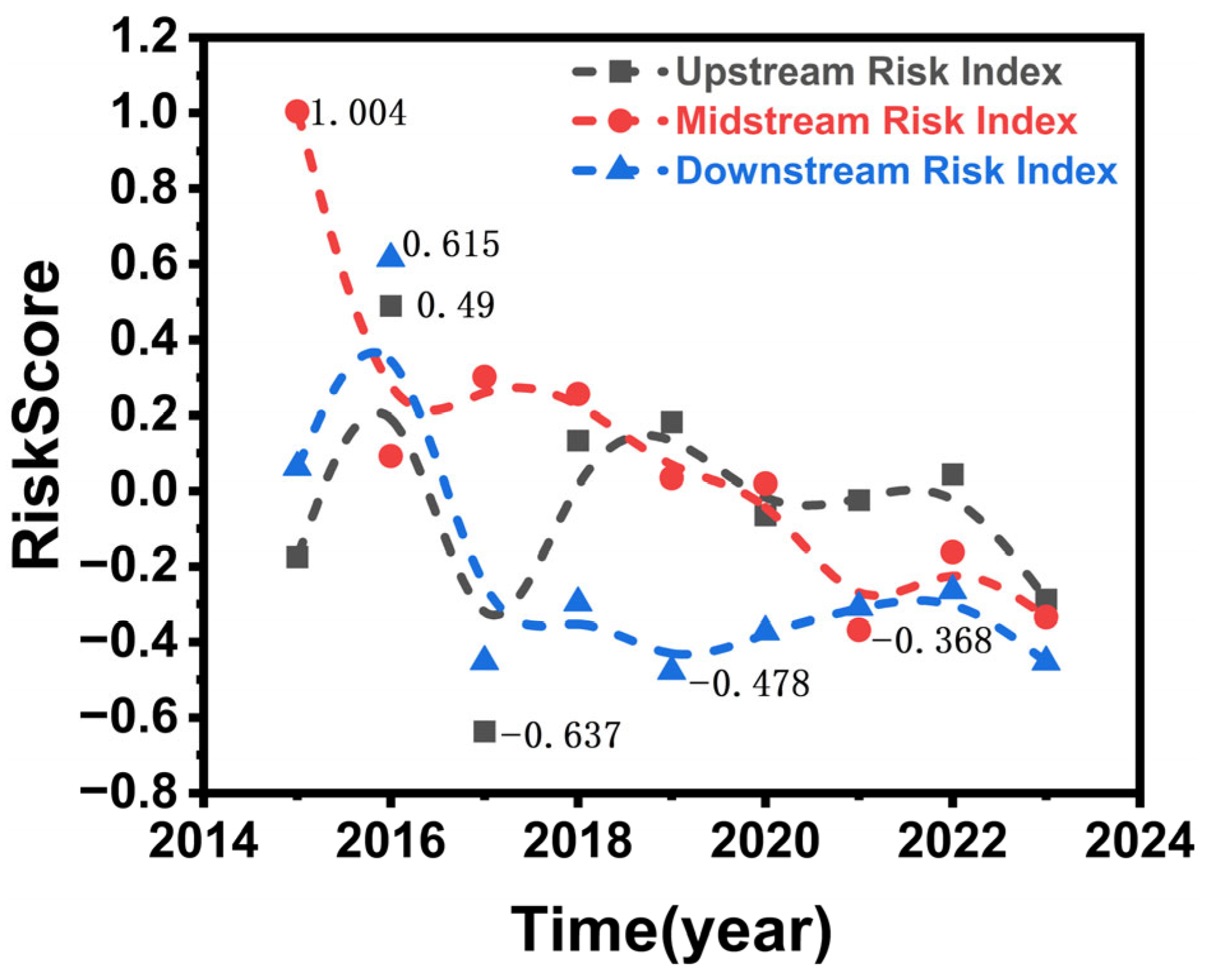 | Midstream firms show improving efficiency but pronounced risk volatility over time (Figure 5, Figure 6 and Figure 7), limiting the sustainability of efficiency gains. | Efficiency–risk mismatch caused by unstable risk expectations. | Develop risk-stabilizing supply-chain finance, inventory and warehouse-receipt financing, and digitally enabled contract coordination. | Stabilize risk expectations, allowing efficiency gains to translate into long-horizon upgrading investments. | Financial institutions; midstream processors; supply-chain managers |