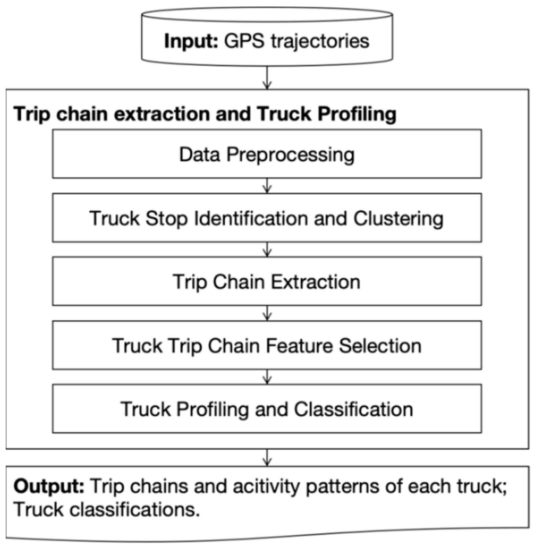 The proposed approach consists of the following four major steps. (1) Truck stops identification and clustering. (2) Trip chain extraction. (3) Truck trip chain feature selection. (4) Truck profiling and classification.