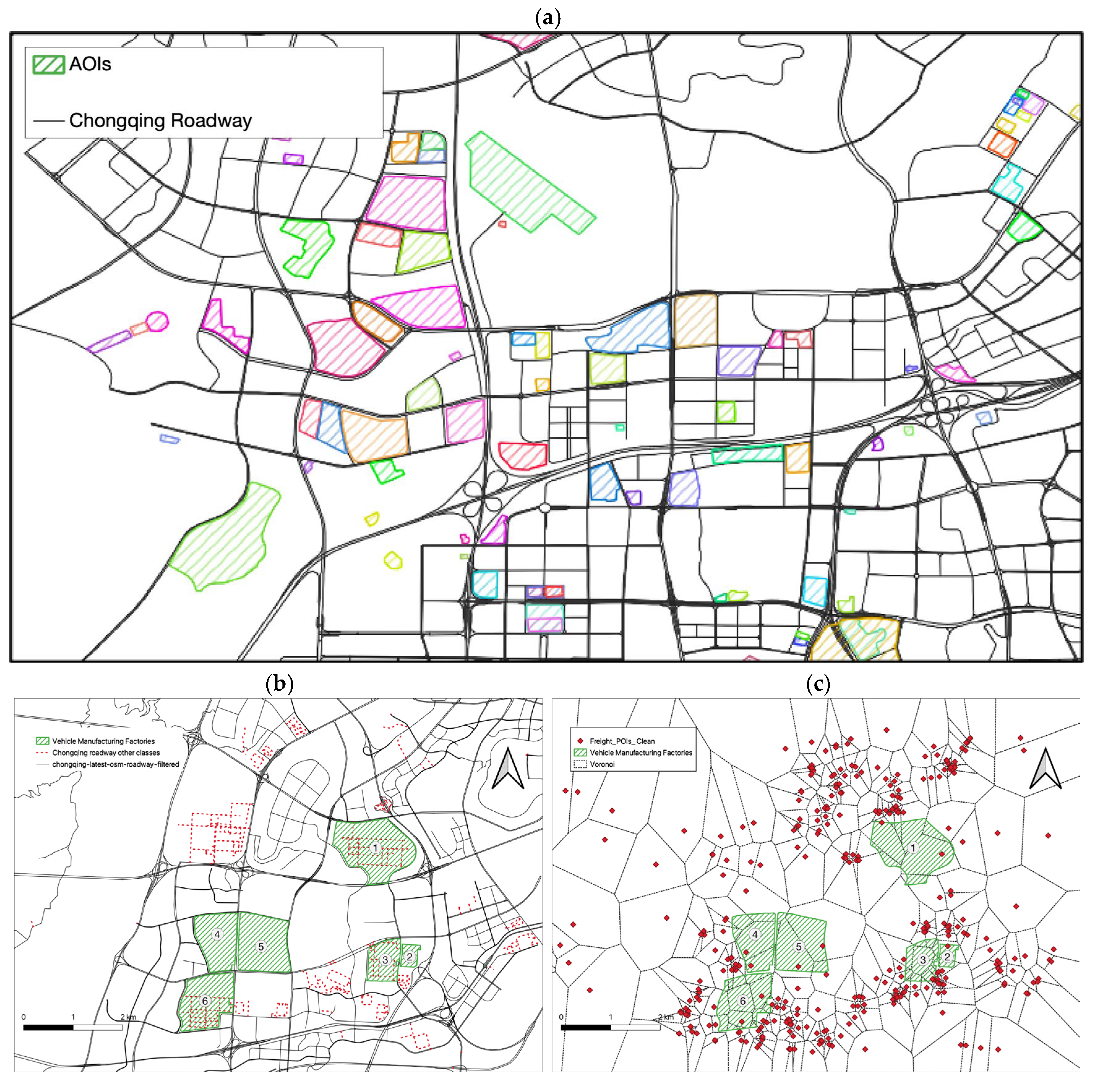 Figure 3b illustrates six of the 7402 AOIs (depicted with green line patterns and labeled ① to ⑥) alongside the OSM roadway network. The gray lines represent roadways filtered to the six selected classes, while the red dashed lines indicate the remaining roadway classes. The figure demonstrates that the selected roadway classes effectively enclose establishments within distinct roadway-defined zones, while roads within the establishments are generally lower-level roadways (depicted in red dashed lines).