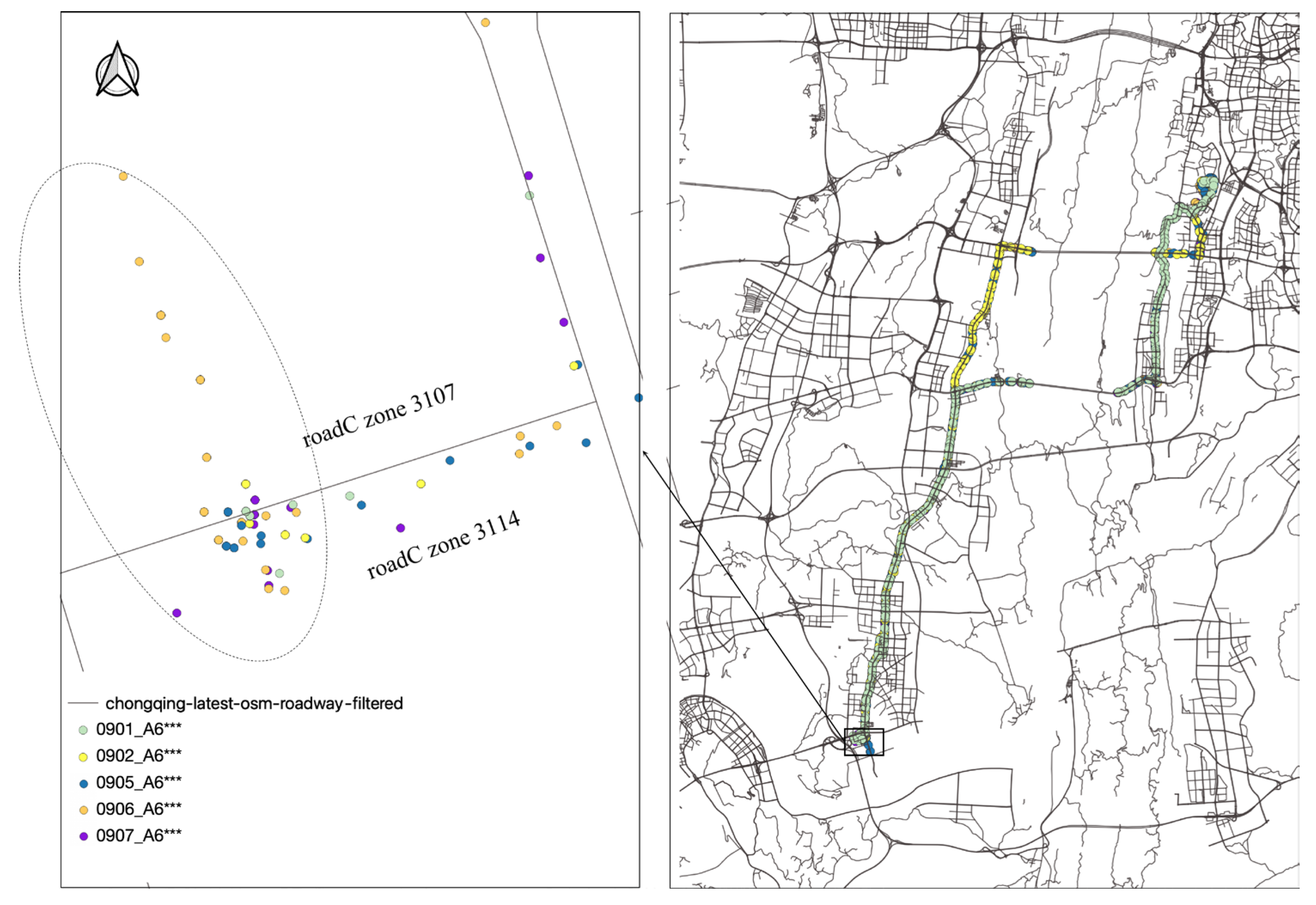 Figure 4 provides an example of connected roadC zones using the trajectory of a truck with plate number ‘A6****’ from 1 September 2023 to 7 September 2023. Different trajectory colors represent different dates, and dotted points within the dashed circle indicate the truck’s stop points, identified as belonging to the same cluster. These stops span two separate roadC zones: 3107 and 3114. Following the criteria, these zones were determined to be connected and grouped into one roadC cluster.