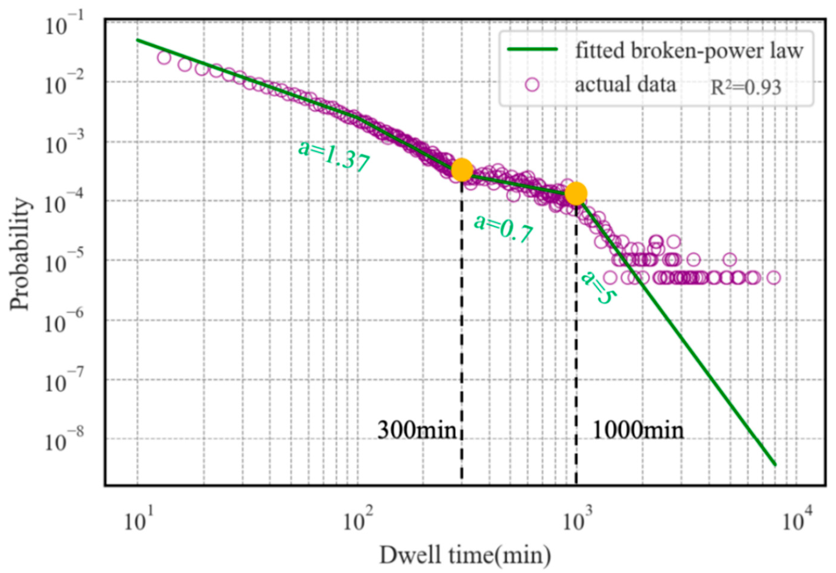 Figure 5): 300 min, indicating stops related to rest or non-operational activities, marking the base or start of a new trip chain, and 1000 min, representing long-term stays where trucks are parked for extended periods without daily use.