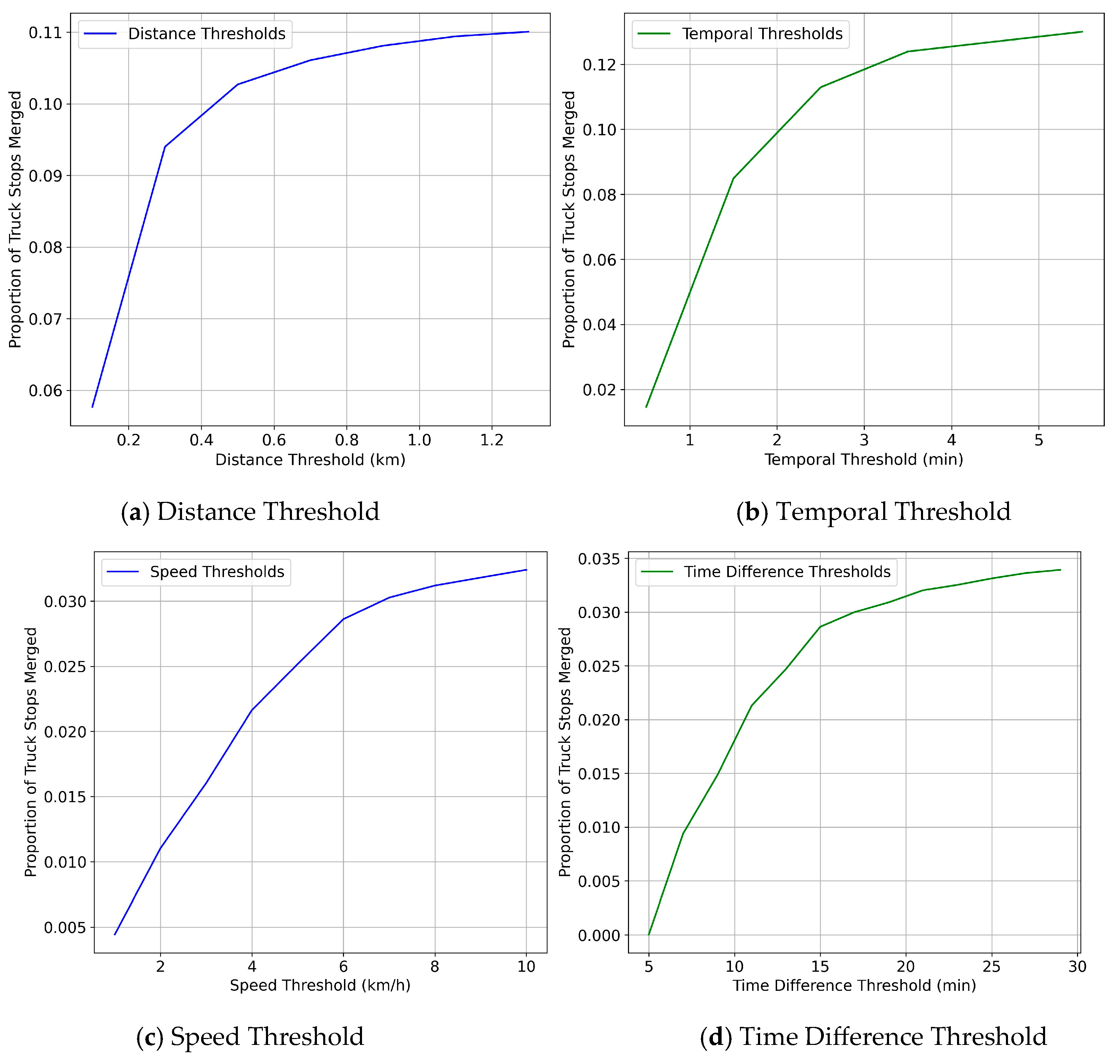 Figure 6b shows the sensitivity to the time threshold. The elbow range was observed between 1.5 and 3.5 min, indicating that selecting a time threshold within this range was acceptable. The speed and time difference thresholds were tested after stops were initially merged based on the first rule. The proportion of stops further merged was then calculated using these parameters. As shown in