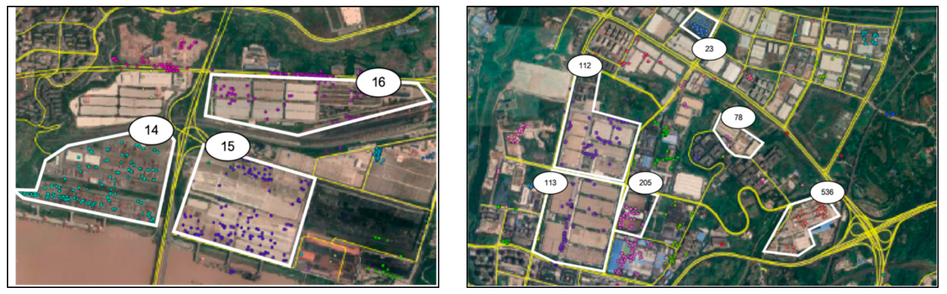 Previous studies often relied on land use data and satellite imagery for method validation, manually comparing clustering results with satellite images. However, land use data provides only general geographic information for polygonal areas with similar land use pattern and cannot differentiate between individual establishments or factories, limiting its application for detailed validation. Similarly, satellite imagery lacks precise boundaries for distinguishing between different factories or establishments. In this study, we address these limitations by using both AOI (Area of Interest) data and satellite images to validate the accuracy of the proposed road-constrained clustering methods. Specifically, we utilized 7402 freight-related AOIs to assess the accuracy of our identification results and employed satellite imagery to visually verify.