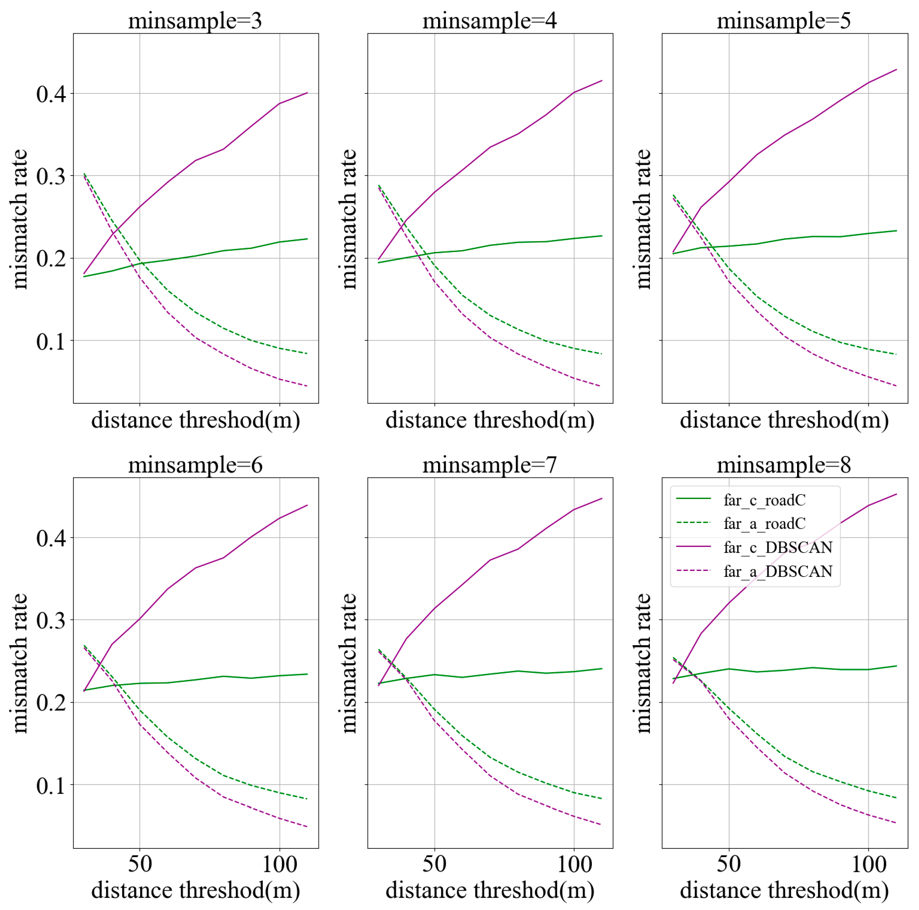 When comparing the proposed method with DBSCAN, we see that the proposed method was particularly effective in reducing the FAR_C value. Specifically, the solid purple line (representing DBSCAN) increases more sharply as the distance threshold grows, while the solid green line (representing the proposed method) shows a more gradual increase. This suggests that the proposed method is more robust at preventing different AOIs (such as establishments and hubs) from being mistakenly grouped into the same cluster. In contrast, the FAR_A values between the two methods did not show significant differences.