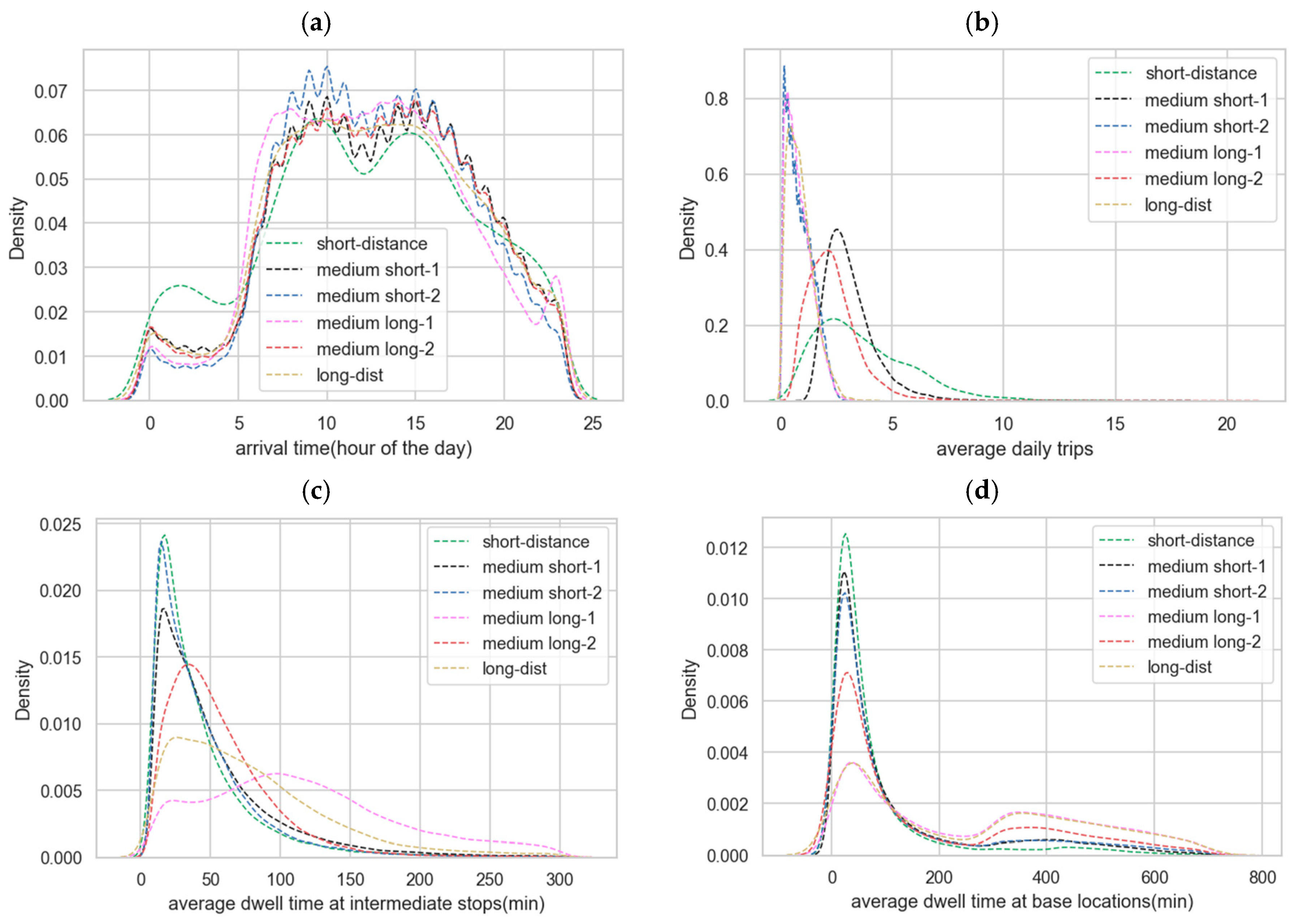 Figure 10c highlights the average dwell time at intermediate stops, where the C4 truck group exhibits a unique pattern. For this group, dwell times have two peaks: one around 15 min and another at approximately 100 min. This distribution differs significantly from other groups, indicating distinct operational behaviors.
