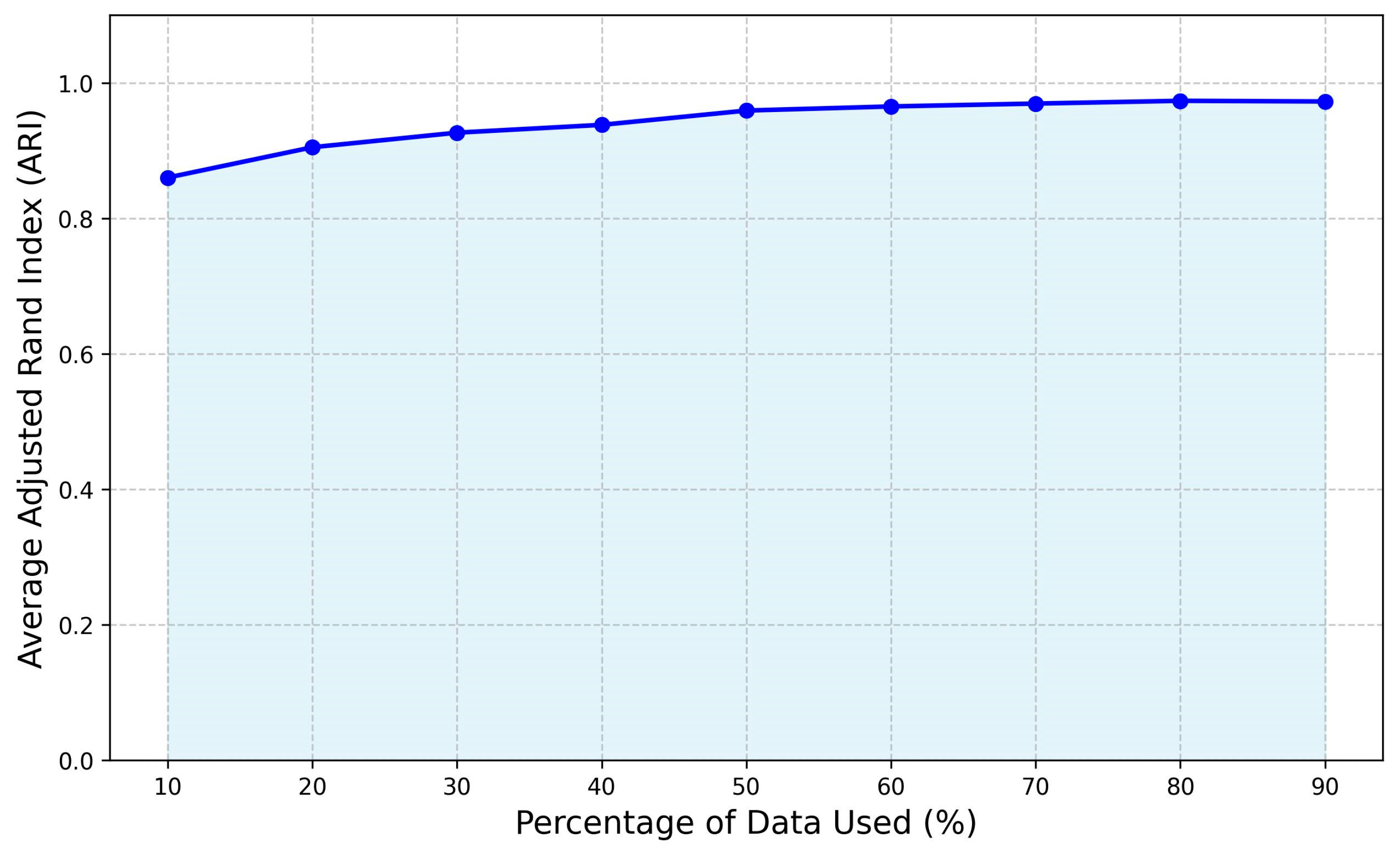 Figure 11 summarizes the ARI scores across different levels of missing data. As shown, the ARI scores remained consistently high across all sampling levels, demonstrating the robustness of the clustering results. Even when only 10% of the data was available, the ARI score was still above 0.86, and for samples exceeding 50%, the scores consistently exceeded 0.95. These results suggest that the clustering method was resilient to the absence of data and that the truck behavior clusters were not overly sensitive to the specific data points included in the analysis. The stability of the ARI scores, even with progressively larger amounts of missing data, indicates that the variables selected for the clustering process captured strong, underlying patterns in truck travel behavior. This highlights the robustness of the identified truck categories, ensuring that they reflected generalizable, empirical groupings of truck travel behavior rather than being contingent on specific data points.