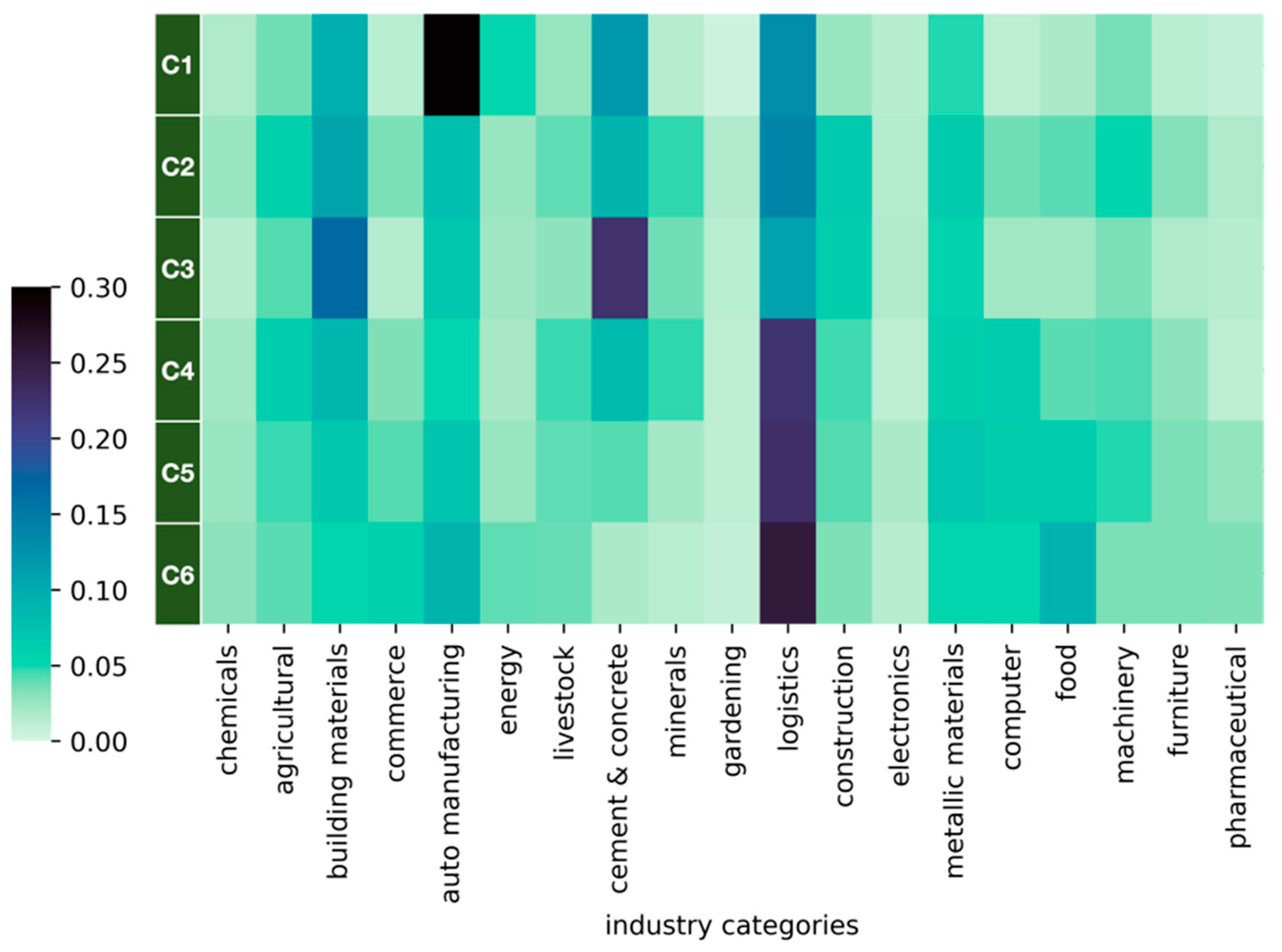 In this section, we analyze the potential industries served by each group of trucks. Each truck was assigned an industry category according to data provider, covering a total of 19 distinct industry classifications.