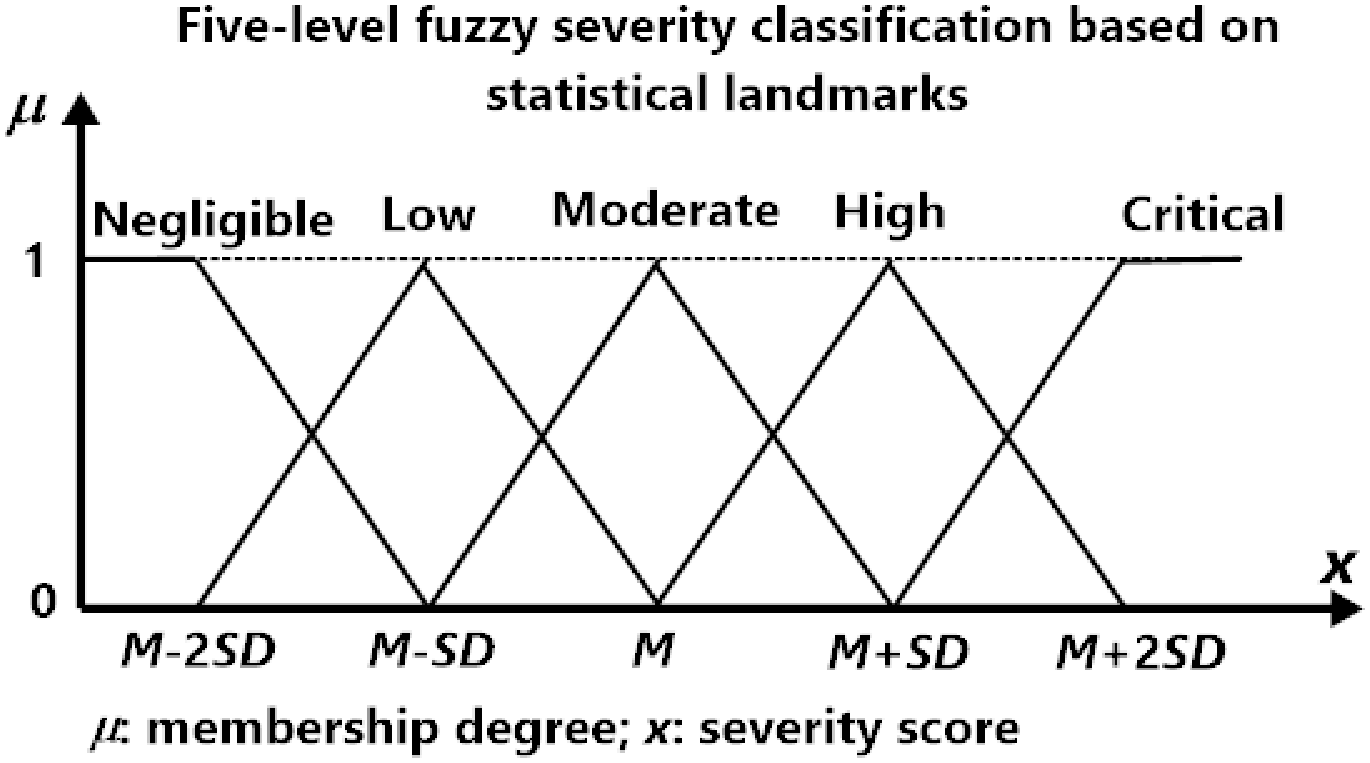 A five-level fuzzy risk severity classification was developed using statistical landmarks, with triangular membership functions centered around the sample mean and its standard deviation. These membership functions form a symmetric fuzzy partition of severity levels, ranging from negligible to critical.