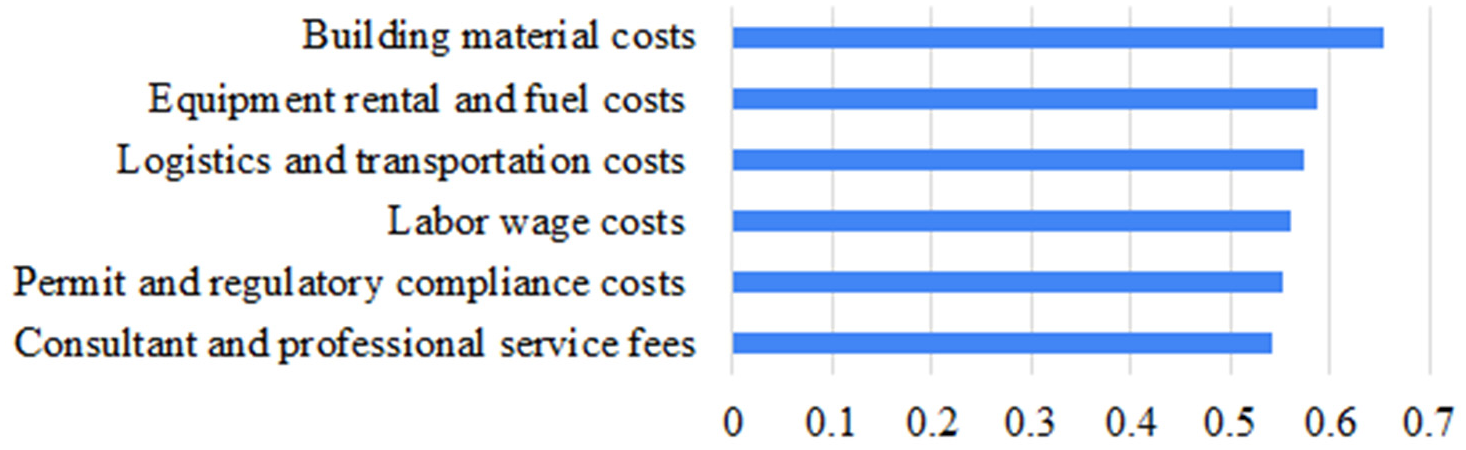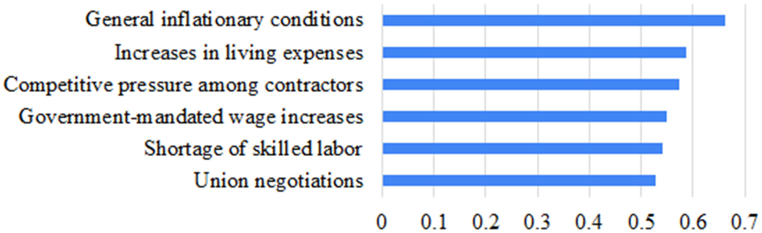 Figure 7 presents respondents’ perceptions of the key factors contributing to labor wage increases in construction projects. It appears that macroeconomic conditions and cost-of-living pressures are the primary drivers of wage increases, with market competition and policy-driven wage adjustments playing secondary roles. Strong consensus among respondents indicates that general inflationary trends directly translate into higher wage demands and labor costs in the construction sector. As living expenses rise, workers are forced to seek higher wages to maintain purchasing power. It appears that competition among contractors for available labor contributes to upward pressure on wages. Government-mandated wage increases suggest that regulatory interventions play a moderate but notable role in shaping wage levels. Additionally, shortages of skilled workers contribute to wage escalation to a lesser extent than broader economic and regulatory factors. The influence of union negotiations on wage increases is perceived as having the least impact.