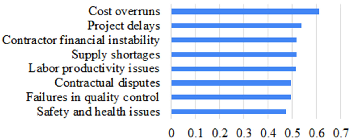 By contrast, schedule delays, quality failures, contractual disputes, and safety-related issues are perceived as secondary inflation-induced consequences. Although delays linked to labor wage and material price fluctuations are reported, their lower mean values and higher dispersion suggest variability driven by project-specific sensitivity and managerial effectiveness. These results indicate that inflation primarily manifests as financial pressure, while time and quality impacts remain contingent on mitigation capacity and operational control [