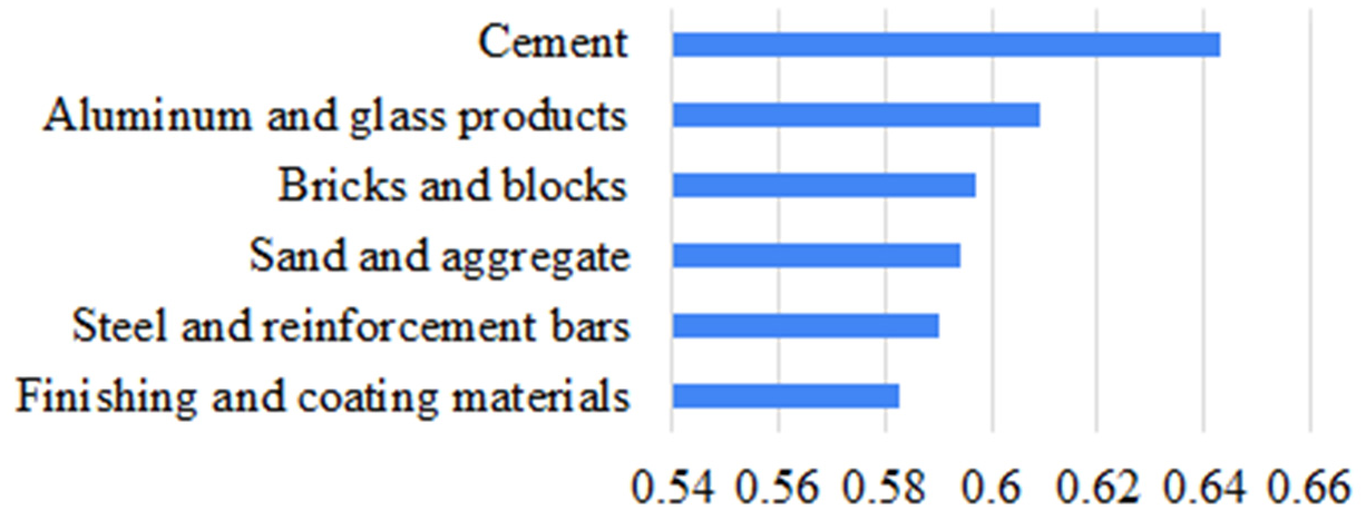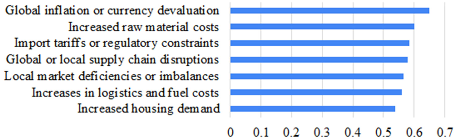 Material price volatility emerged as the most influential contributor to inflation-related risk, with cement, aluminum, and glass products identified as the most affected material categories. Participants consistently attribute these increases to macroeconomic and global supply-chain forces, including currency devaluation, global inflation, and rising raw material costs, rather than project-level inefficiencies. The high concentration reinforces the characterization of material price volatility as a structural and systemic condition affecting the residential construction sector as a whole. These effects are exacerbated by energy-intensive production processes, imported inputs, and international market fluctuations. Similar impacts have been observed in other construction domains facing inflationary and supply-chain disruptions, including transportation infrastructure projects [