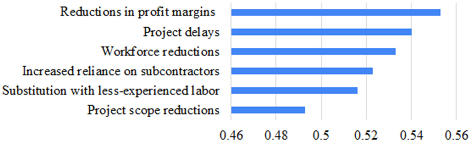 Figure 8 indicates that financial and schedule-related impacts are the most prominent consequences of rising labor wages, although the overall mean scores suggest moderate significance levels. Increasing labor wages primarily affects project profitability, confirming that labor cost escalation directly erodes contractors’ margins. High labor costs can also disrupt project schedules, possibly due to workforce adjustments or cost-related decision-making delays. Modifying labor allocation, such as resizing crews or changing labor intensity are common responses to wage increases by contractors. The increased use of subcontractors reflects the trend toward outsourcing certain activities as a cost-management strategy. By substituting less experienced workers for skilled ones, labor costs could be contained, but quality and productivity may suffer. Scope reduction, although still relevant, is perceived as having the lowest impact on labor wage increases.