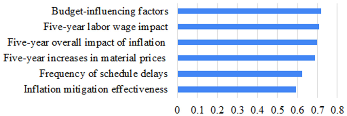 Figure 9. It appears that inflation exerts a strong influence on project budgets, particularly through direct cost escalation. Inflation-related factors are widely perceived to increase residential project budgets, reflecting a strong consensus on inflation’s budgetary impact. A five-year inflation impact on labor wages and an overall five-year inflation impact on residential construction were both rated as highly significant, illustrating labor cost escalation as a major inflationary pressure. Materials prices have also risen over the past five years, affecting project budgets. Unfortunately, the effectiveness of inflation mitigation strategies received the lowest ranking, implying that although mitigation measures are in place, their perceived effectiveness in offsetting inflation-induced cost and time pressures remains limited.