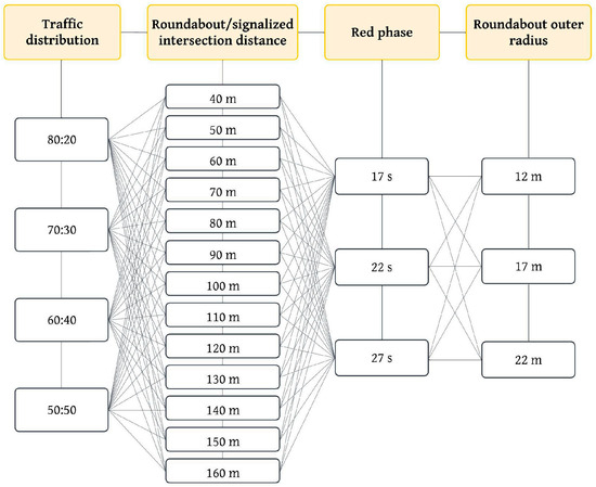 In accordance with recommendations from [20], a total of ten simulations were conducted for each scenario. This encompassed 12 scenarios of an isolated roundabout and 468 scenarios examining the impact of a signalized intersection on an adjacent roundabout, resulting in a cumulative total of 4800 microsimulations. The duration of the simulation was 24 h and 15 min, which included a 15 min warm-up period during which traffic was loaded into the road network. The remaining time was dedicated to the simulation.