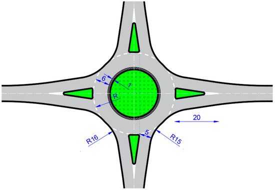 - Mahdalova, I.; Krivda, V.; Skvain, V. Influence of Roundabout Inscribed Circle Diameter to the Traffic Safety. Appl. Mech. Mater. 2013, 409–410, 1122–1125. [Google Scholar] [CrossRef]