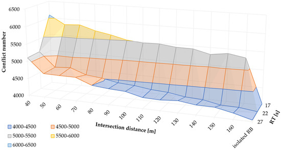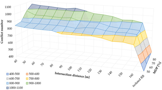 The practical value of the research is reflected in the development of a predictive model and three-dimensional diagrams, which can serve as tools for a rapid evaluation of different road network planning variants. The model for predicting the number of conflicts enables assessing the safety implications of such interventions before the actual construction or reconstruction of an intersection. It complements the findings of the author’s previous study [28], in which a model was proposed for estimating travel time between a roundabout and a signalized intersection. Together, these models provide concrete tools and quantitative criteria that support decision-making in the road network planning process from both the traffic efficiency and traffic safety perspectives.