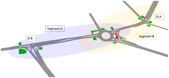 - Signalized intersection (four-leg)—SI A—located 122 m from the roundabout;