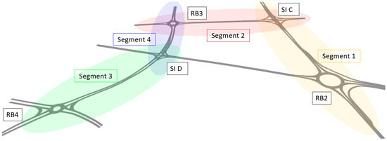 - Roundabout (four-leg)—RB3—located 230 m from SI C and 125 m from SI D;